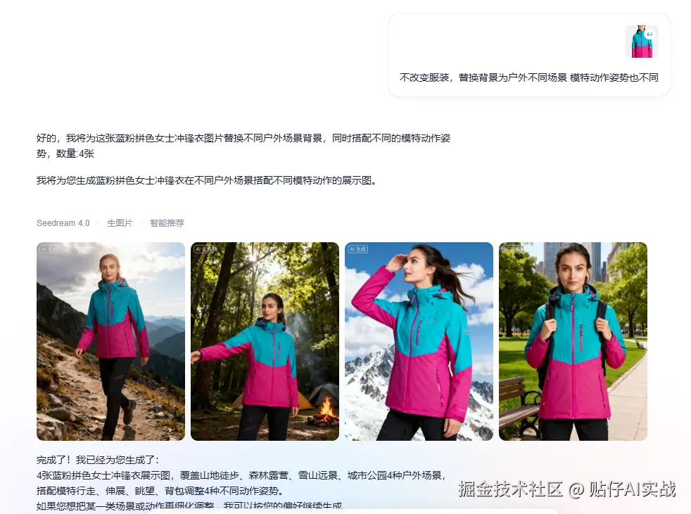“不改变服装,替换背景为户外不同场景,模特动作姿势也不同”,一键生成即可。