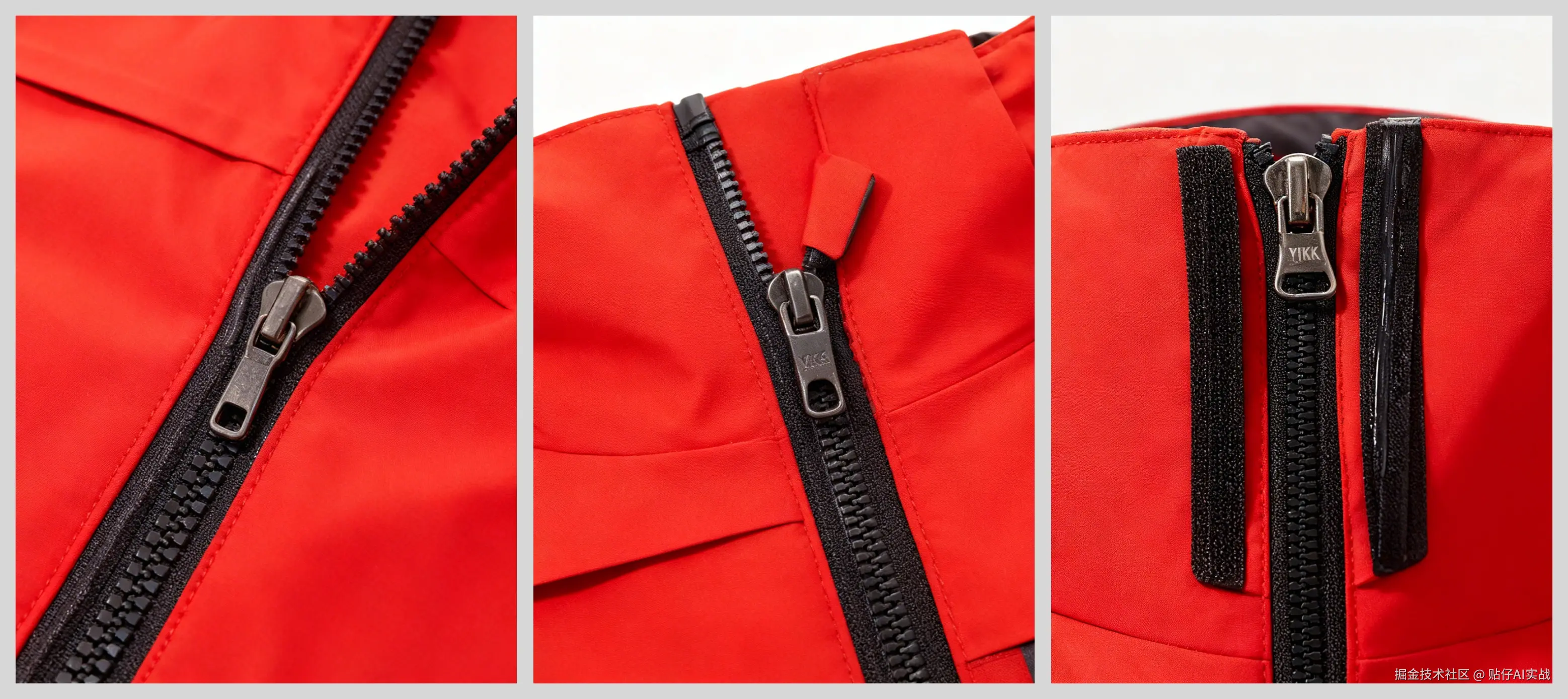 - YKK防水拉链:展示拉链闭合时的防水密封条细节