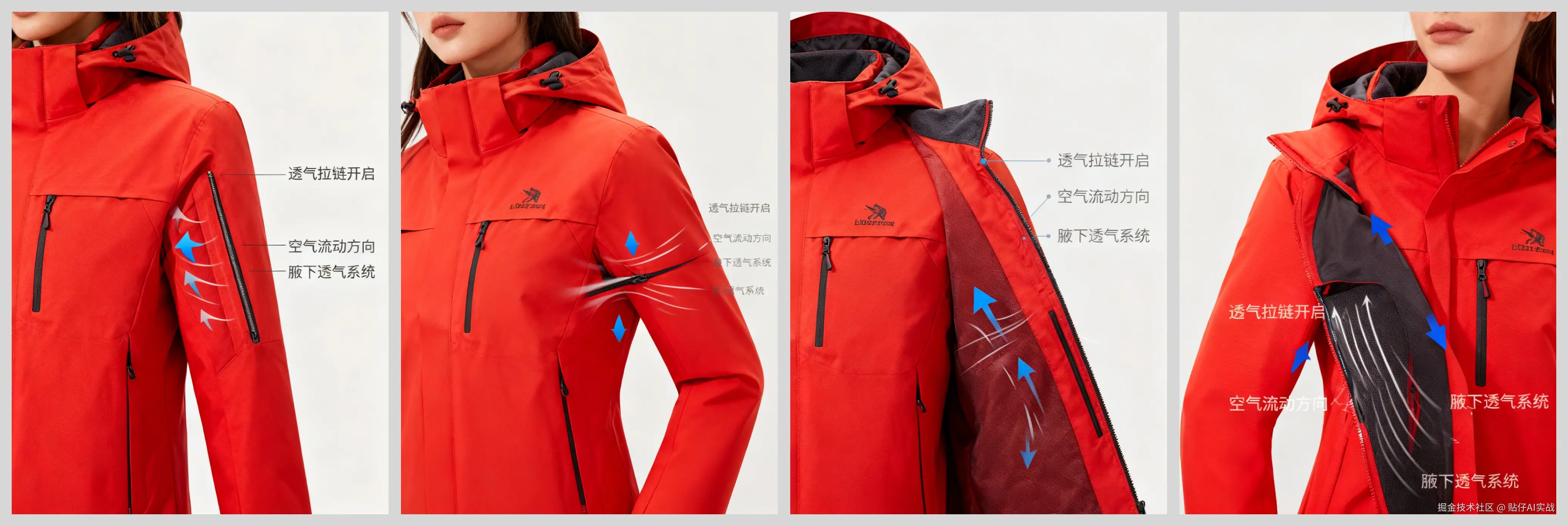 - 腋下透气拉链:展示开启状态与空气流动示意图