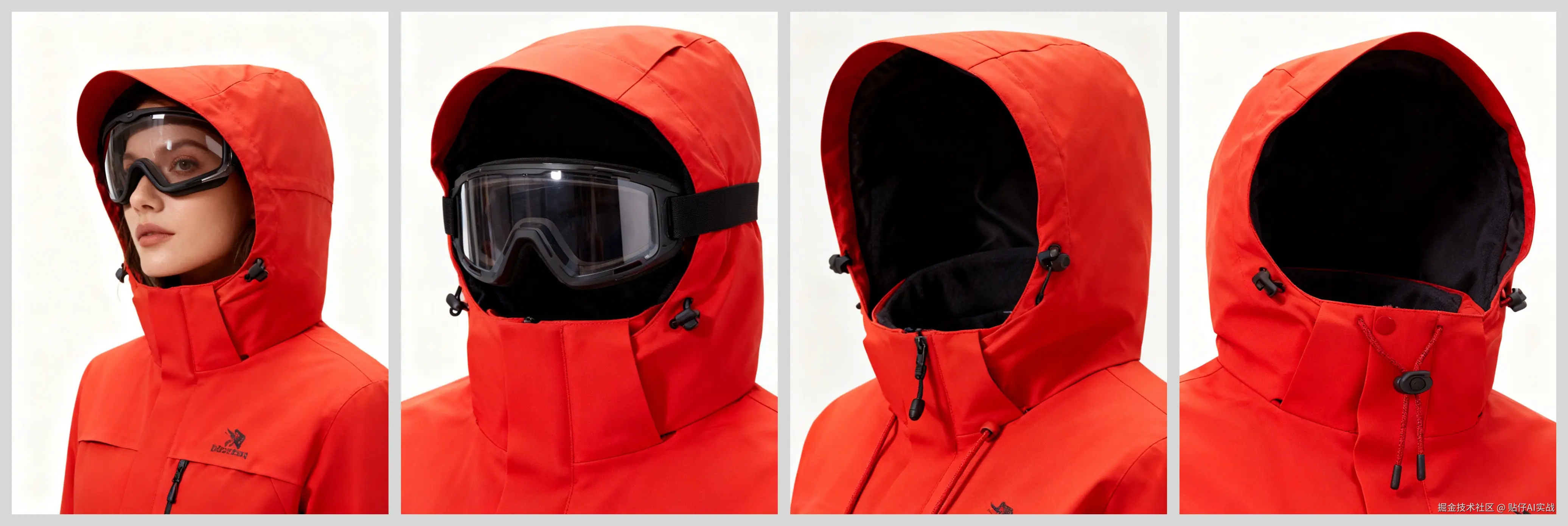 - 可调节风帽:展示三维调节系统,内置防刮护目镜
