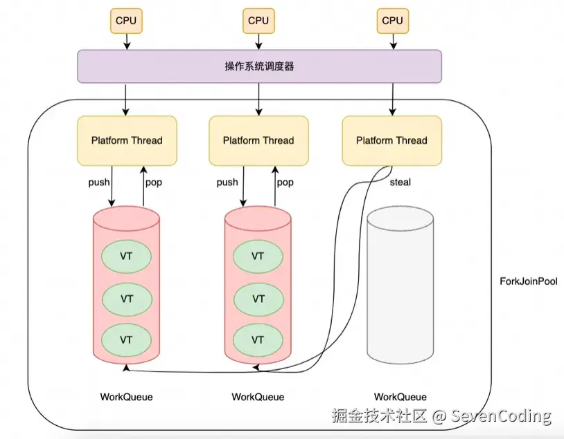 虚拟线程并不会直接分配给cpu去执行,而是通过调度器分配给平台线程,平台线程再被调度器管理。Java中虚拟线程的调度器采用了工作窃取的模式进行FIFO的操作,调度器的并行数默认是Jvm获取的处理器数量(通过该方法获取的数量Runtime.getRuntime().availableProcessors()),调度器并非分时(time sharing)的。在使用虚拟线程编写程序时,不能控制虚拟线程何时分配给平台线程,也不能控制平台线程何时分配给cpu。