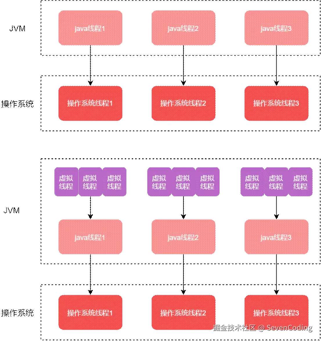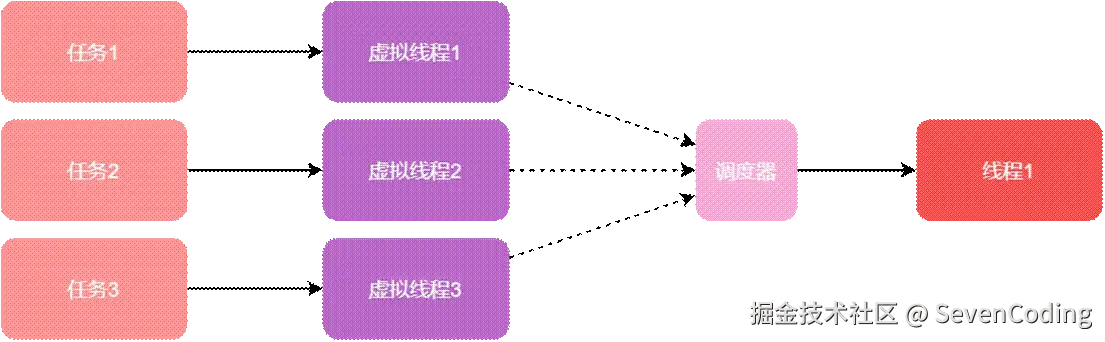 使用虚拟线程之后,任务-虚拟线程-调度器-平台线程的关系,1个平台线程可以被调度器分配不同的虚拟线程: