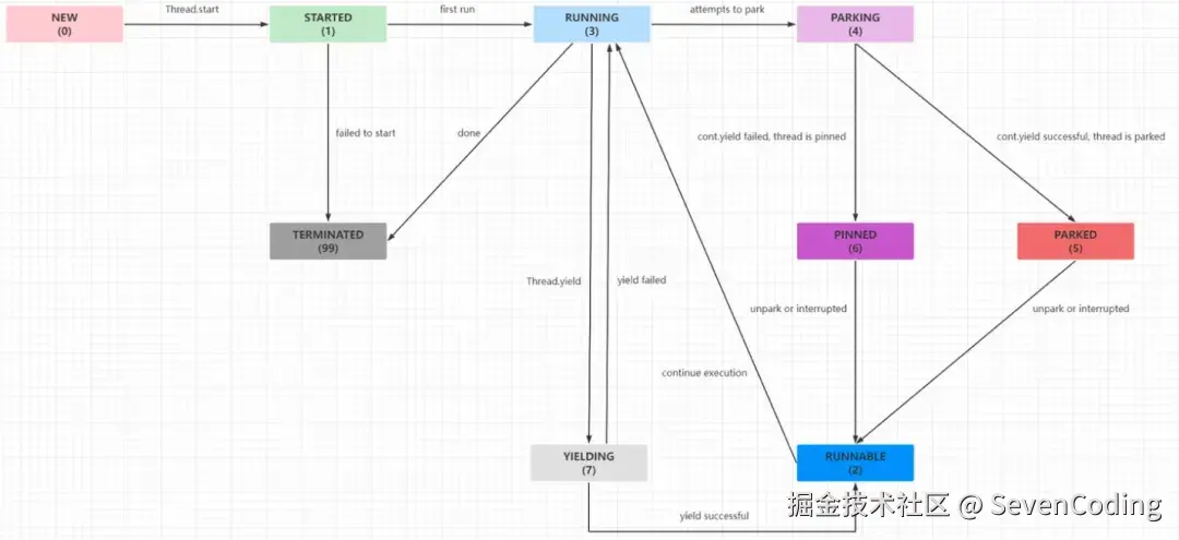 2. 普通线程会阻塞在read本地方法调用上(底层应该就是read系统调用),而虚拟线程则会通过VirtualThread#park挂起,这也对应了上面说的,JDK中几乎所有的阻塞点都已经过调整了。VirtualThread维护了一组state状态,调用park后就会设置成PARKING,可以在注释里看到状态之间的流转逻辑。