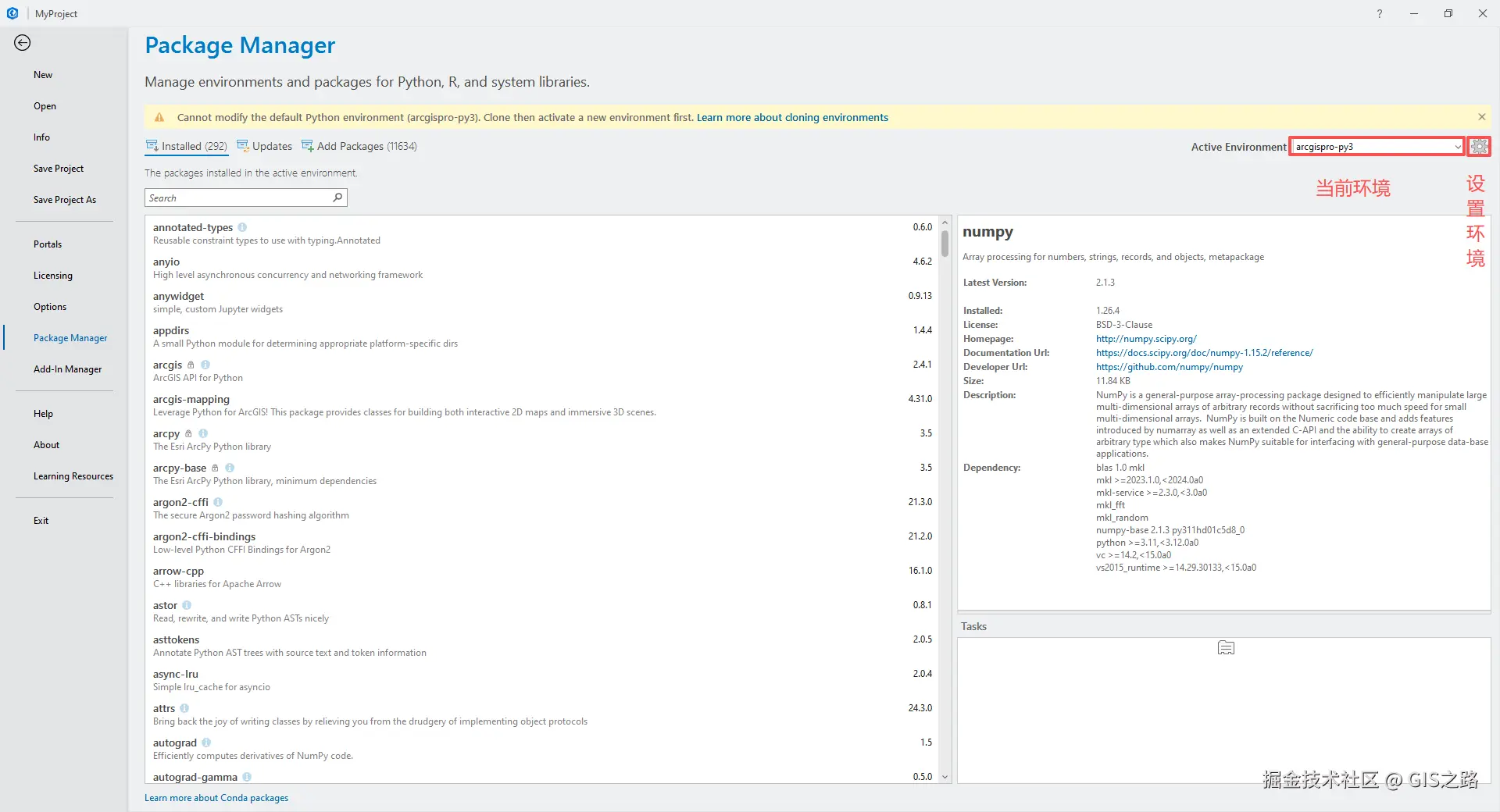 小小声说一下,我本地为了方便,一直使用的是默认arcgispro-py3环境,到目前为止,还没出现什么问题(何时因为环境问题导致ArcGIS Pro软件无法运行,我还会发文进行说明的)。