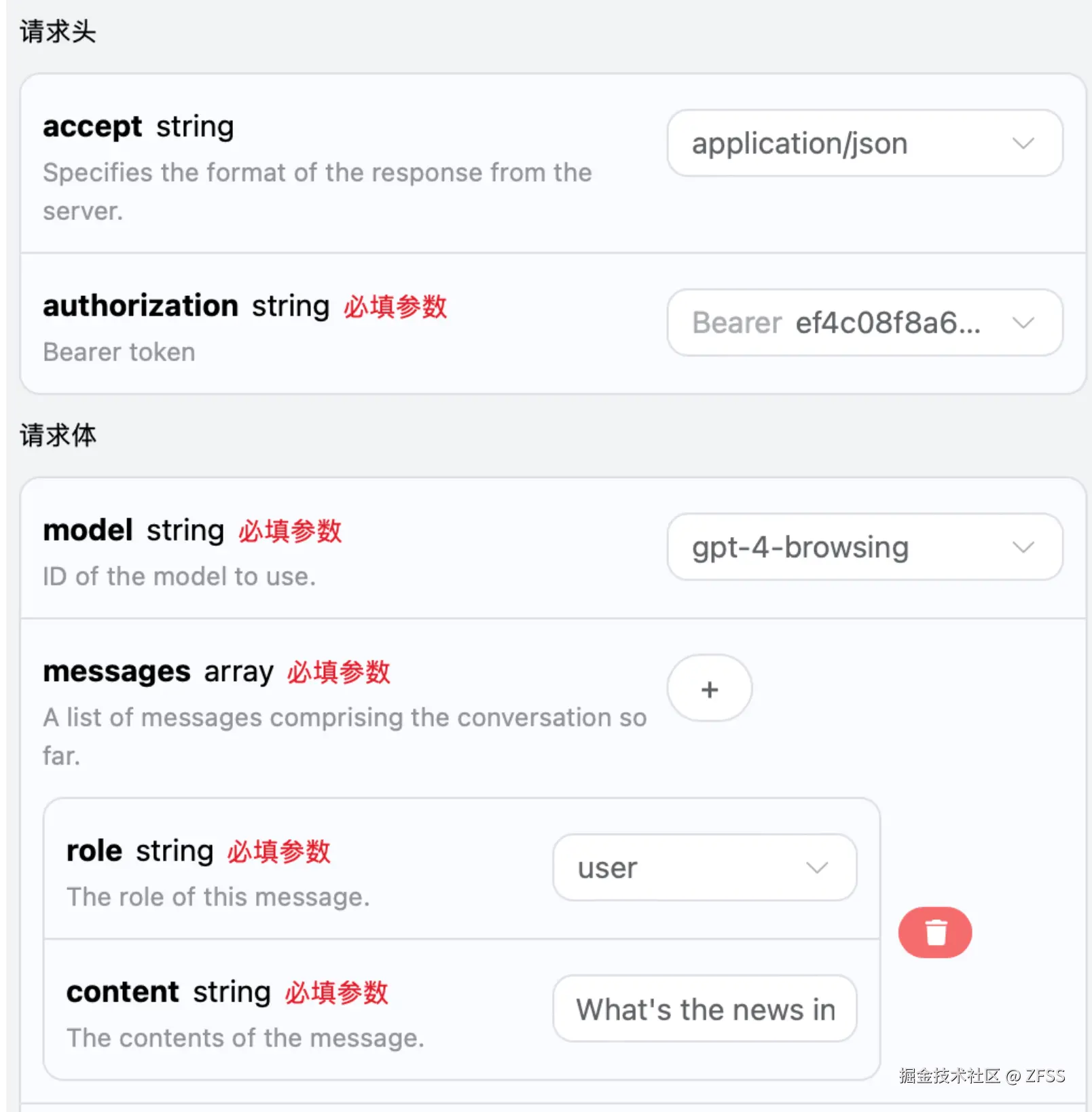 gpt-3.5-browsing 和 gpt-4-browsing 模型与其它模型不同,它可以根据提问词来进行联网搜索,并且将联网搜索的结果进行适当的调整返回给你,本文将通过一个具体示例来演示联网功能,接下来就可以在 OpenAI Chat Completion API 界面上填写对应的内容,如图所示: