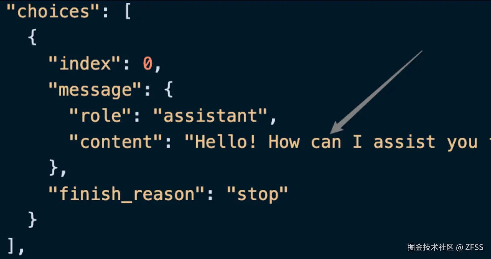 其中 choices 是包含了 ChatGPT 的回答信息,它里面的 choices 是 ChatGPT,可以发现如图所示。