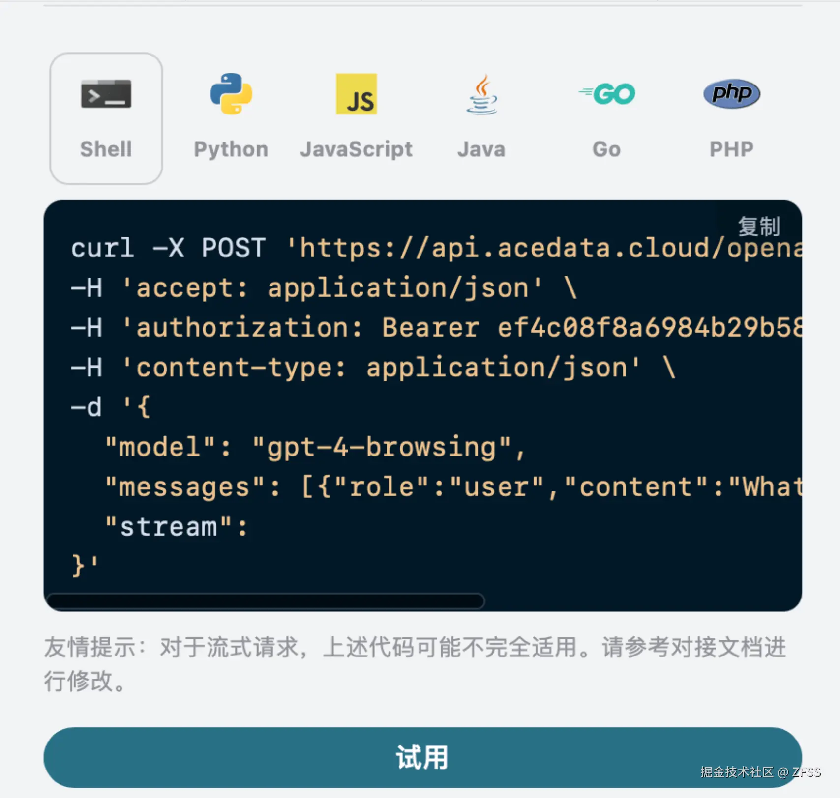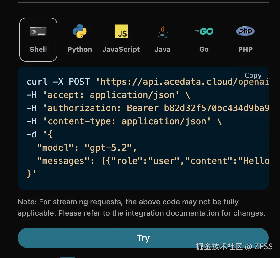 同时您可以注意到右侧有对应的调用代码生成,您可以复制代码直接运行,也可以直接点击「Try」按钮进行测试。