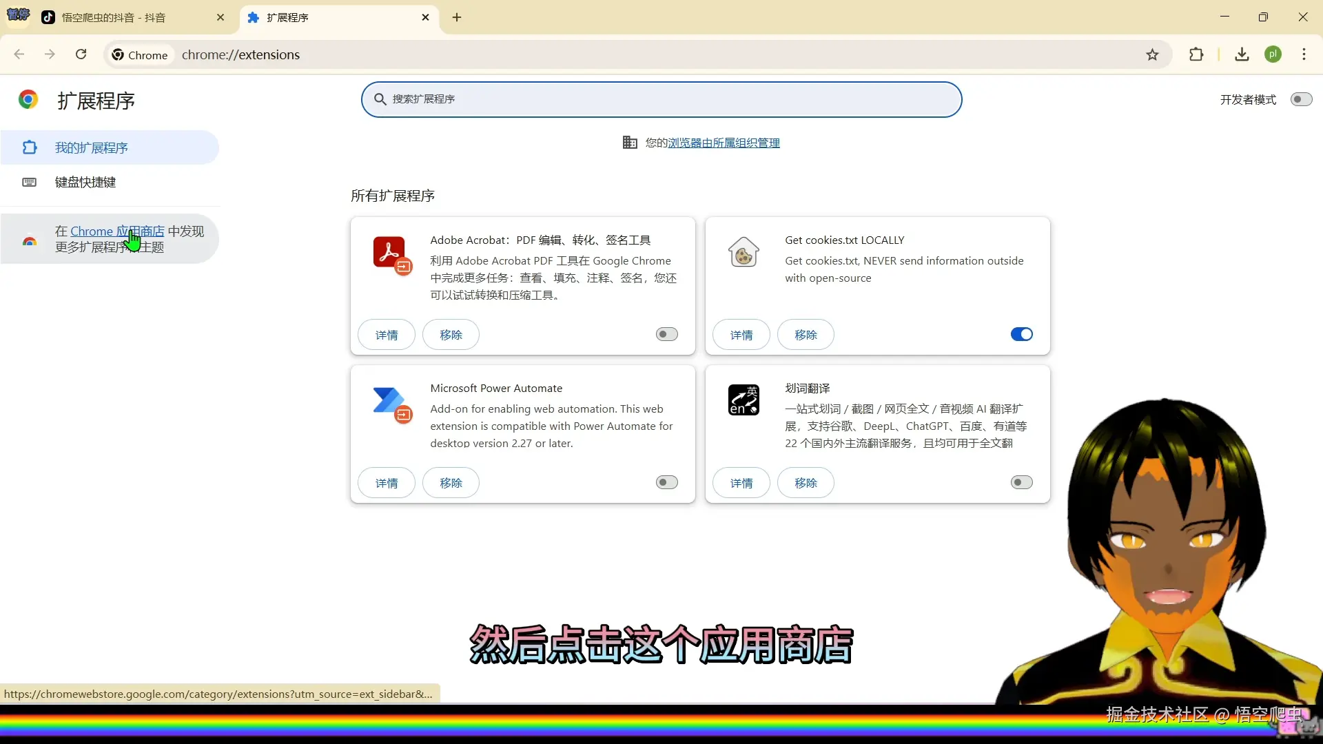 安装步骤如下:打开谷歌浏览器点击右上角 → 管理扩展程序打开 Chrome 应用商店