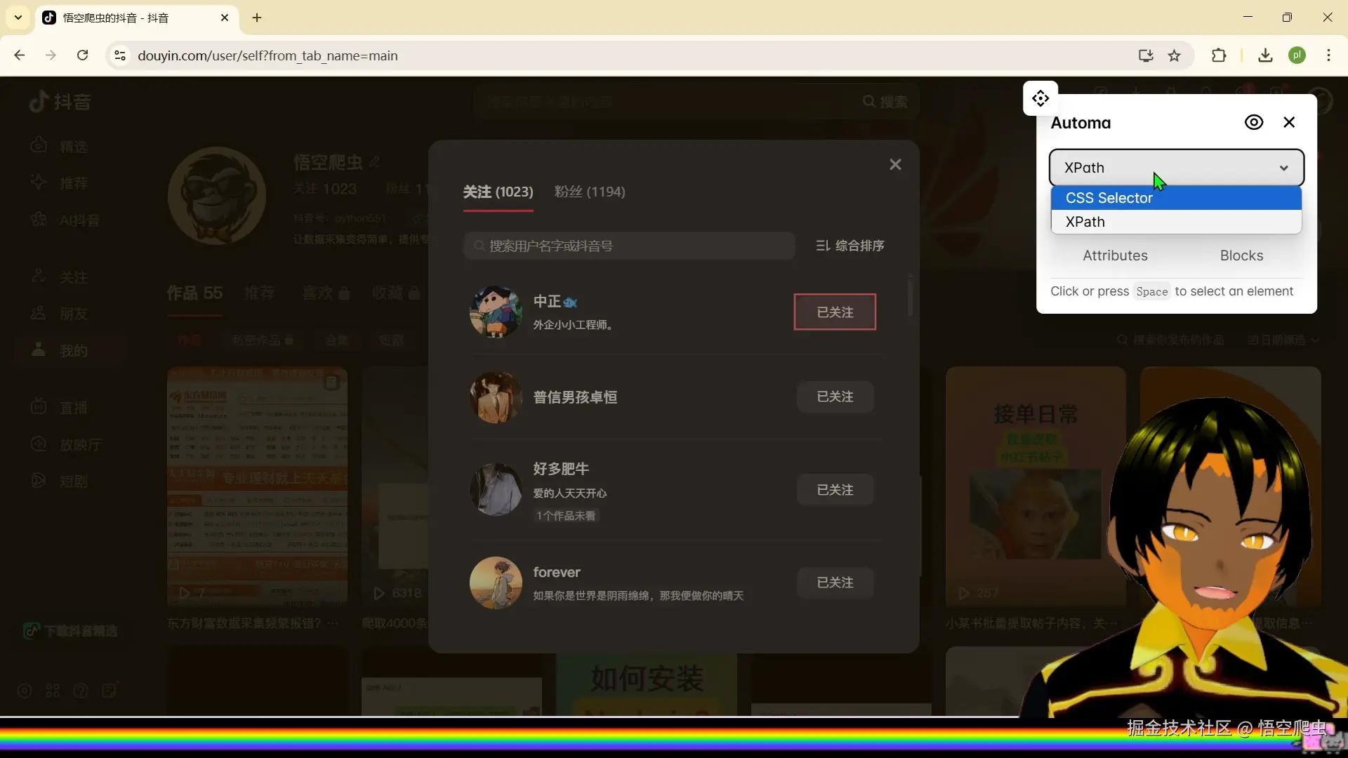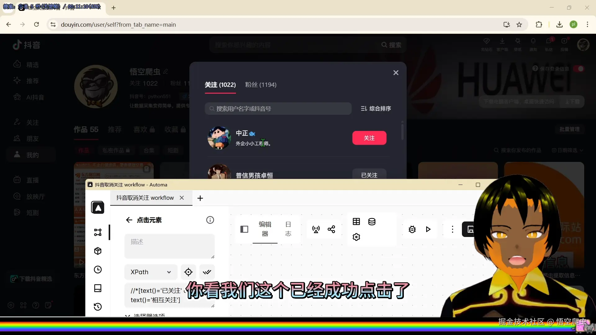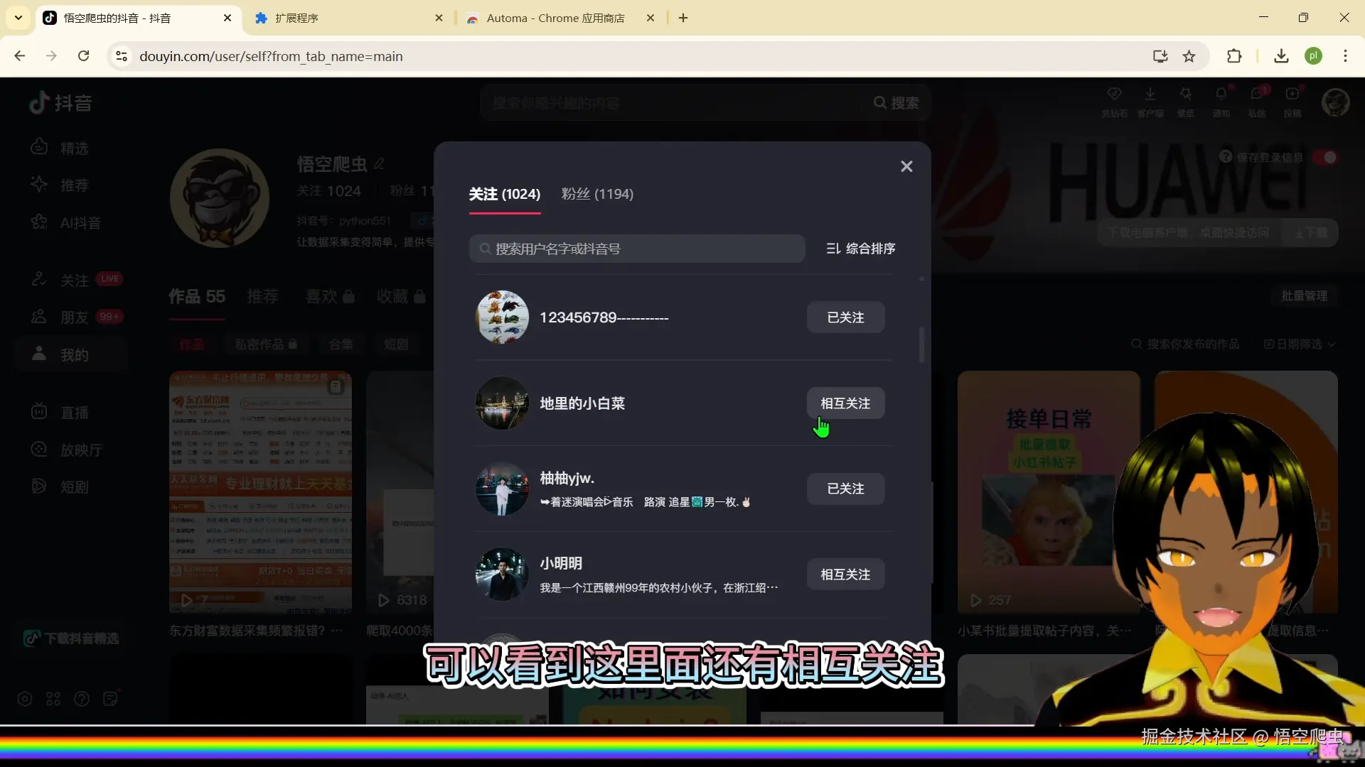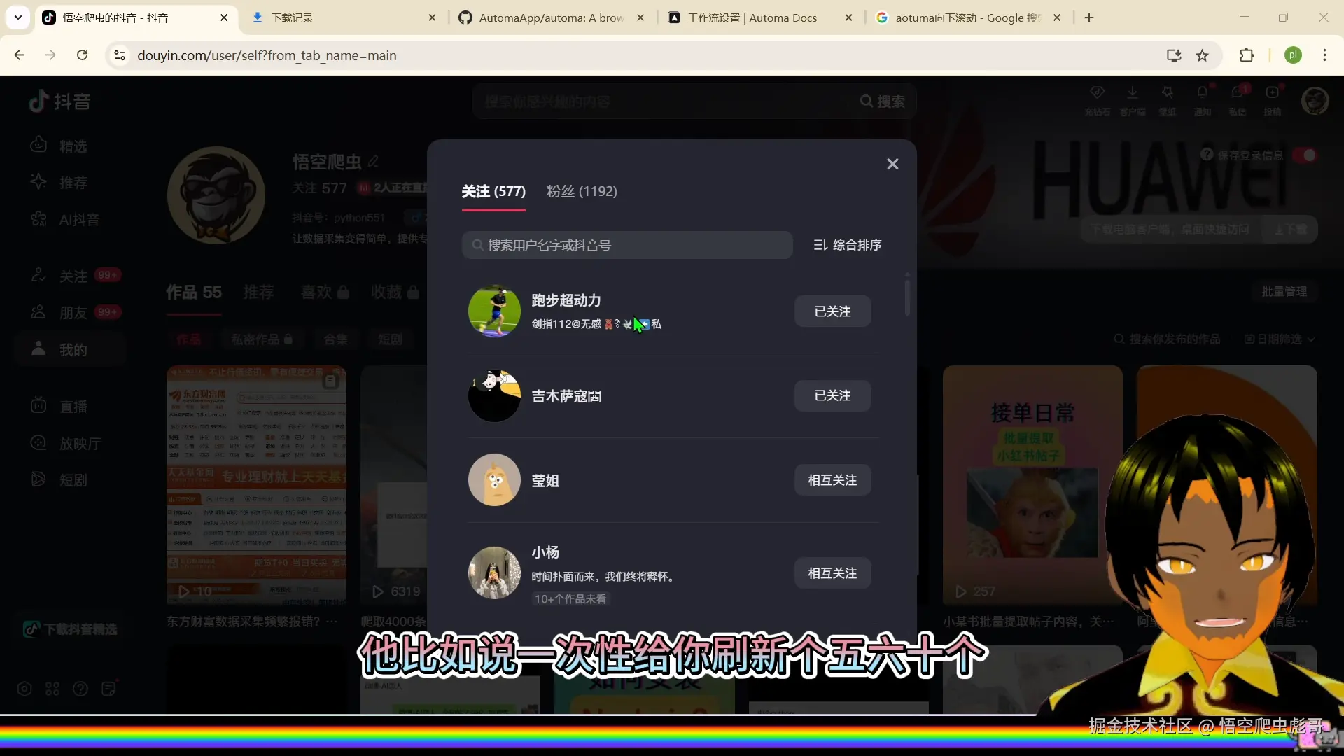 不知不觉中,发现自己的某音关注已经到达了一千多个。如果想让关注数量显示得少一点,就需要一个一个点击取消关注。这种方式非常浪费时间,而且很不优雅。有没有什么方式可以自动取消关注?有的。本文将完整演示如何使用 Automa 编写一个自动批量取消关注的脚本,并分析其优缺点。