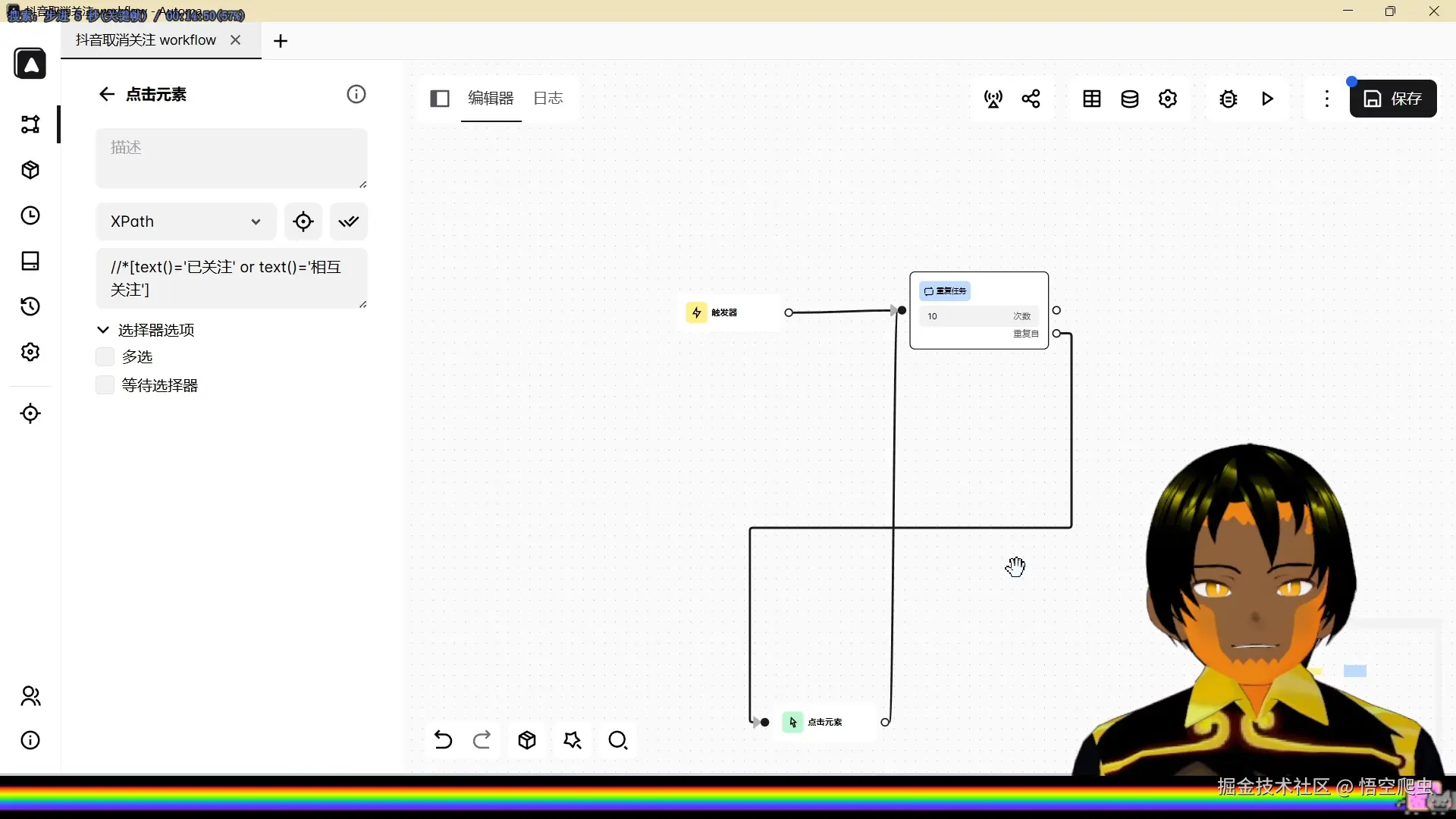 在正式编写工作流之前,我们需要先规划逻辑。目标:找到文本为“已关注”或“相互关注”的按钮,然后点击。通过观察页面可以发现:按钮类型为 button文本可能是“已关注”或“相互关注”因此核心逻辑是: