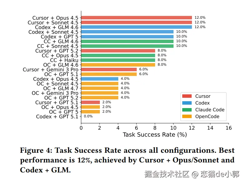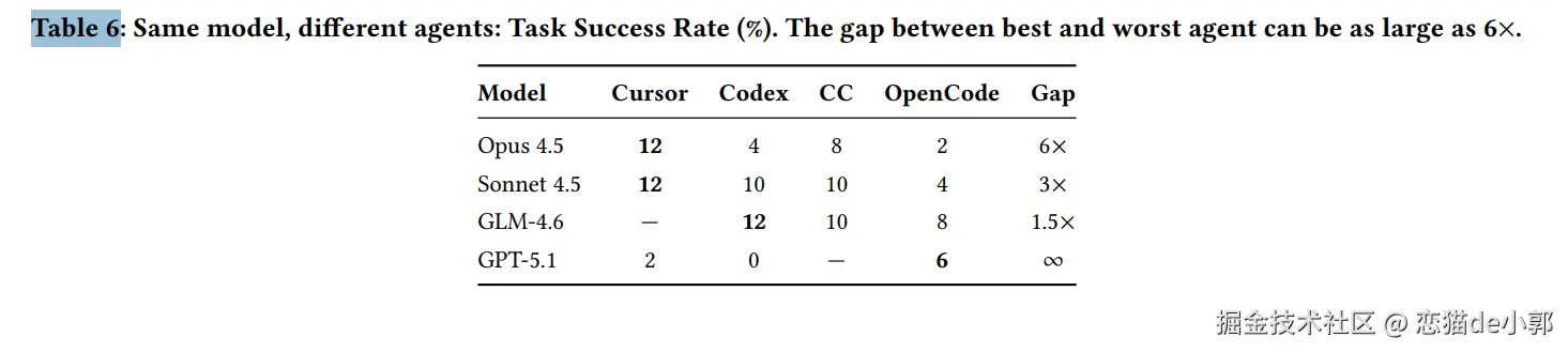 - 智能体架构十分重要 :同一个底层模型,在 Cursor 框架下的成功率为 12%,但在 OpenCode 下仅为 2%,智能体的工具调用、上下文管理等设计与模型本身同等重要