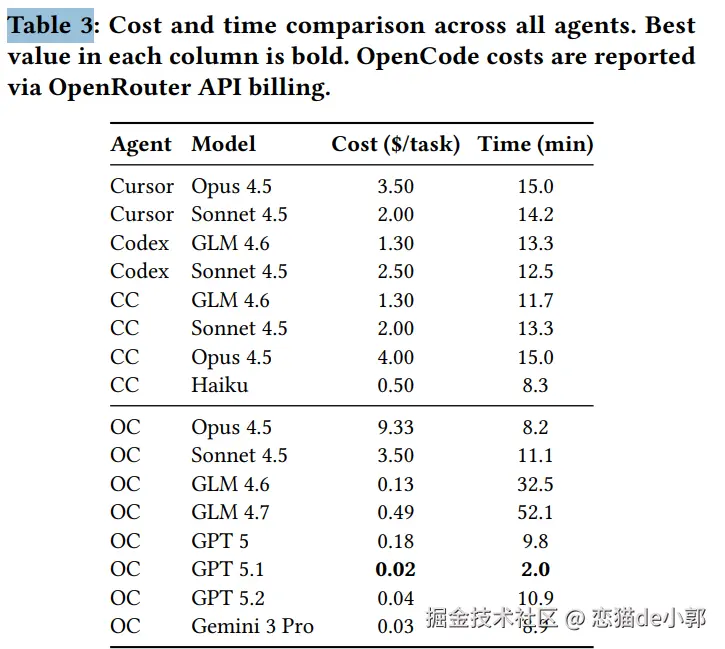 另外,论文也有一个有趣的结论数据,主要统计了各 Agent + Model 的每任务成本(美元)和平均耗时(分钟),例如: