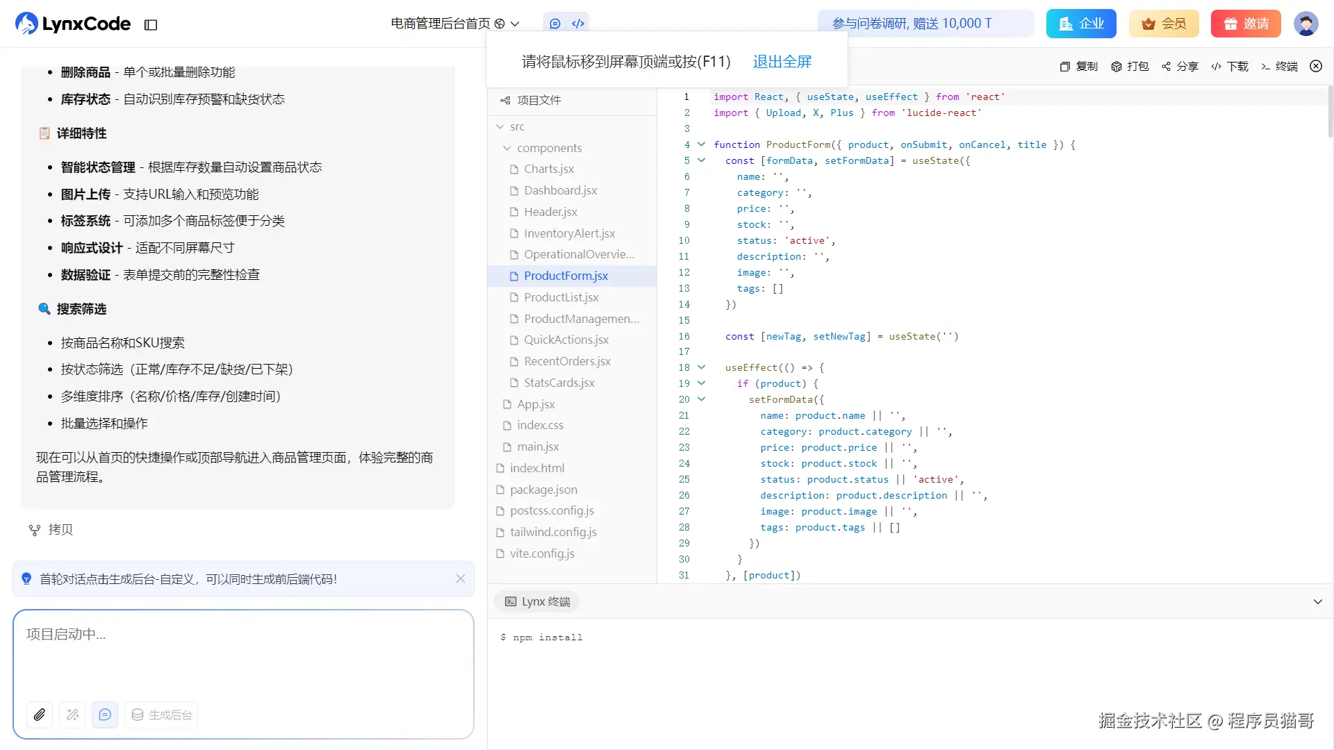 在实际使用中,有些平台已经把流程进一步简化。例如 lynxcode(也就是原来的 lynx AI)采用自然语言驱动的方式,不仅可以生成静态页面,还能同时生成前后端结构与数据库模型。对于只是想快速验证页面效果的人来说,可以先生成纯静态结构,再按需扩展为完整应用。