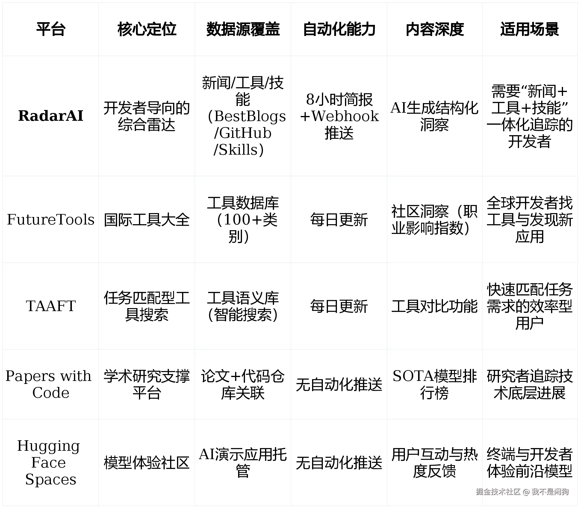 - 开发者/技术决策者:优先使用RadarAI(综合覆盖)+ Papers with Code(学术深度),前者提供实时动态与机会洞察,后者辅助理解技术原理;