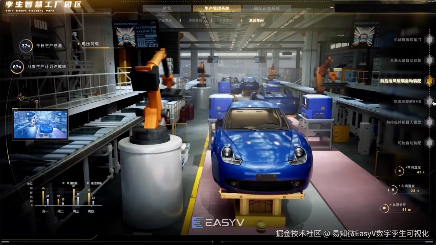 1:1全面复现汽车生产车间的生产要素,动态分析设备运行状态,预测生产隐患故障,实现从零件生产、测试研发、产品组装、质量检验到订单配送的全链路透明化追踪。系统联动全域安防系统,全面掌握车间生产现状,直观查看内部生产细节,实时监控并推送设备运行情况,预警潜在风险。