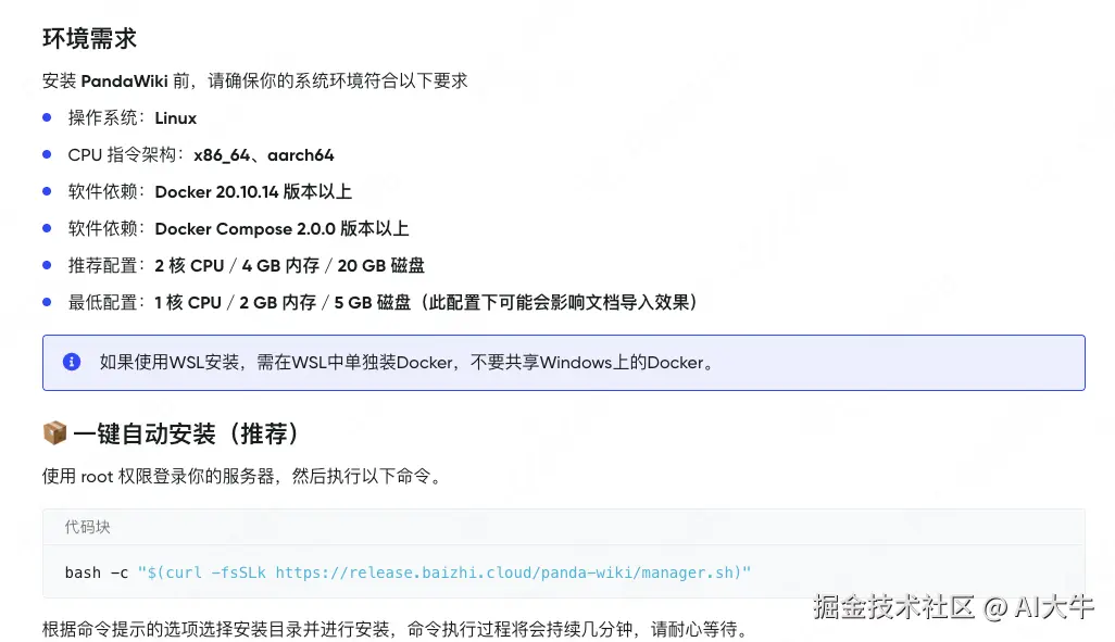 PandaWiki则是"轻量小清新"。它的Docker容器只有2个,内存占用从没超过20%。有个客户把它装在老旧NAS上,照样跑得飞起。不过功能也确实简陋——想改个首页样式?得自己改CSS代码;想统计文档访问量?没有后台数据看板。鱼和熊掌,确实不可兼得。