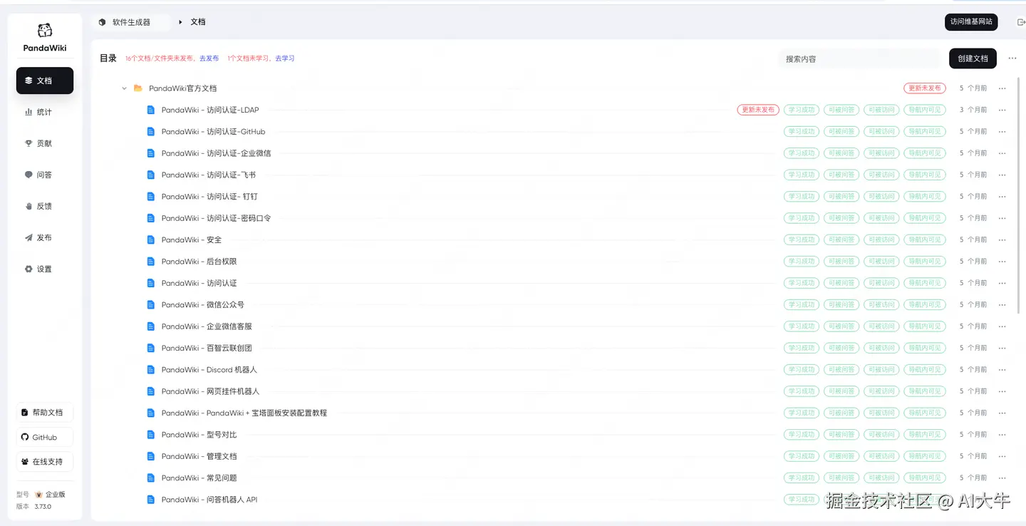 PandaWiki则是为非技术人员设计的。它的界面简洁直观,上传文档、管理分类都很顺手。上周教会客服小妹用它管理FAQ:上传Excel表格,勾选"自动生成问答对",半小时就搭好了机器人。唯一需要注意的是文档格式——有次市场部传了个带200张图片的PDF,索引建了40分钟,最后还崩了。后来才知道它对大文件支持一般,得拆成小文档。