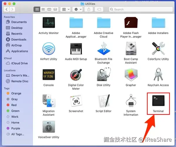 前往“ Finder ”>“应用程序”>“实用工具”>“终端”。