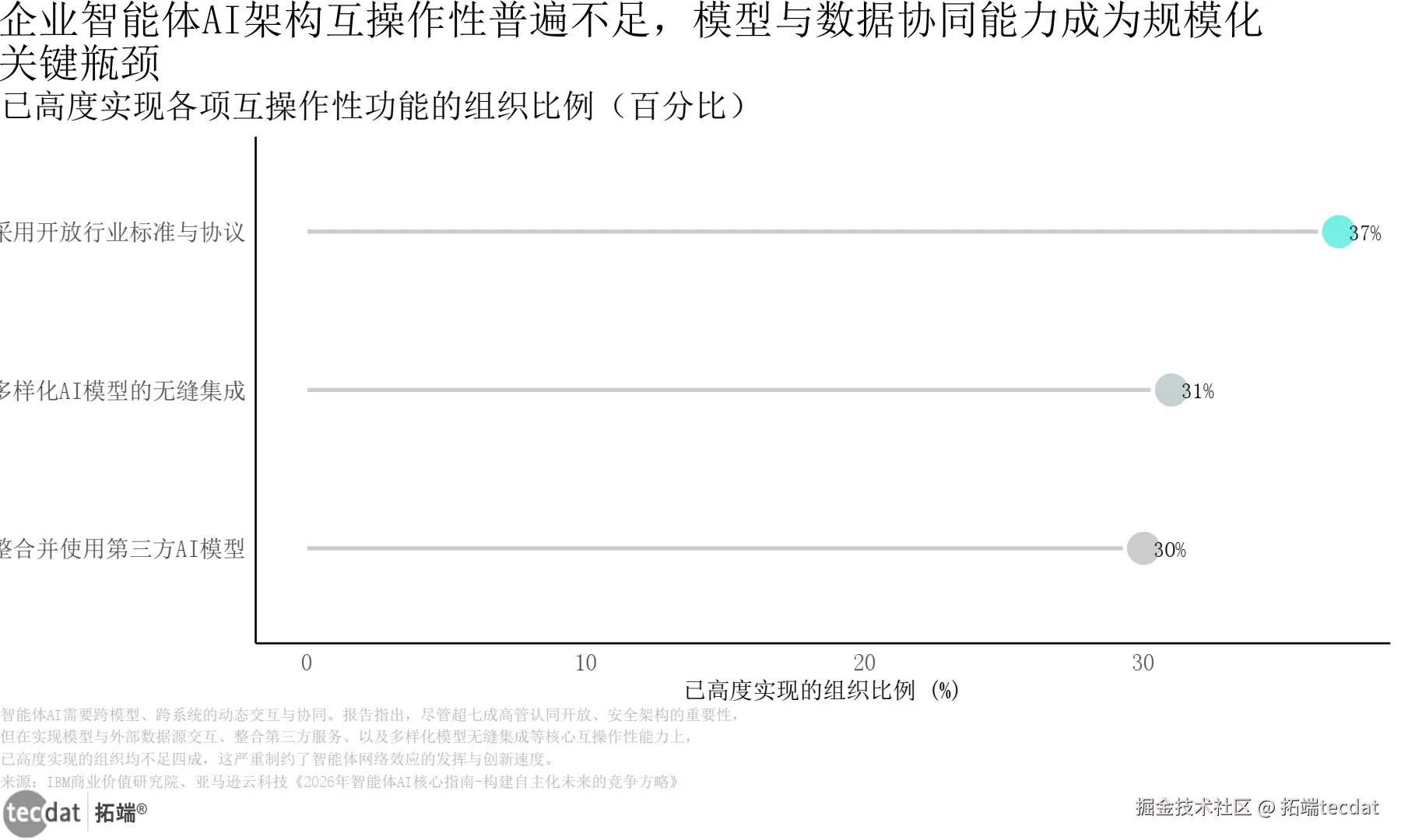 | IBM商业价值研究院《2026年智能体AI核心指南》 | 76%高管认为需要开放架构,但互操作性功能实现不足40% | 互操作性指标:30%-37% | 调研对象为全球大型企业,聚焦战略层面 |