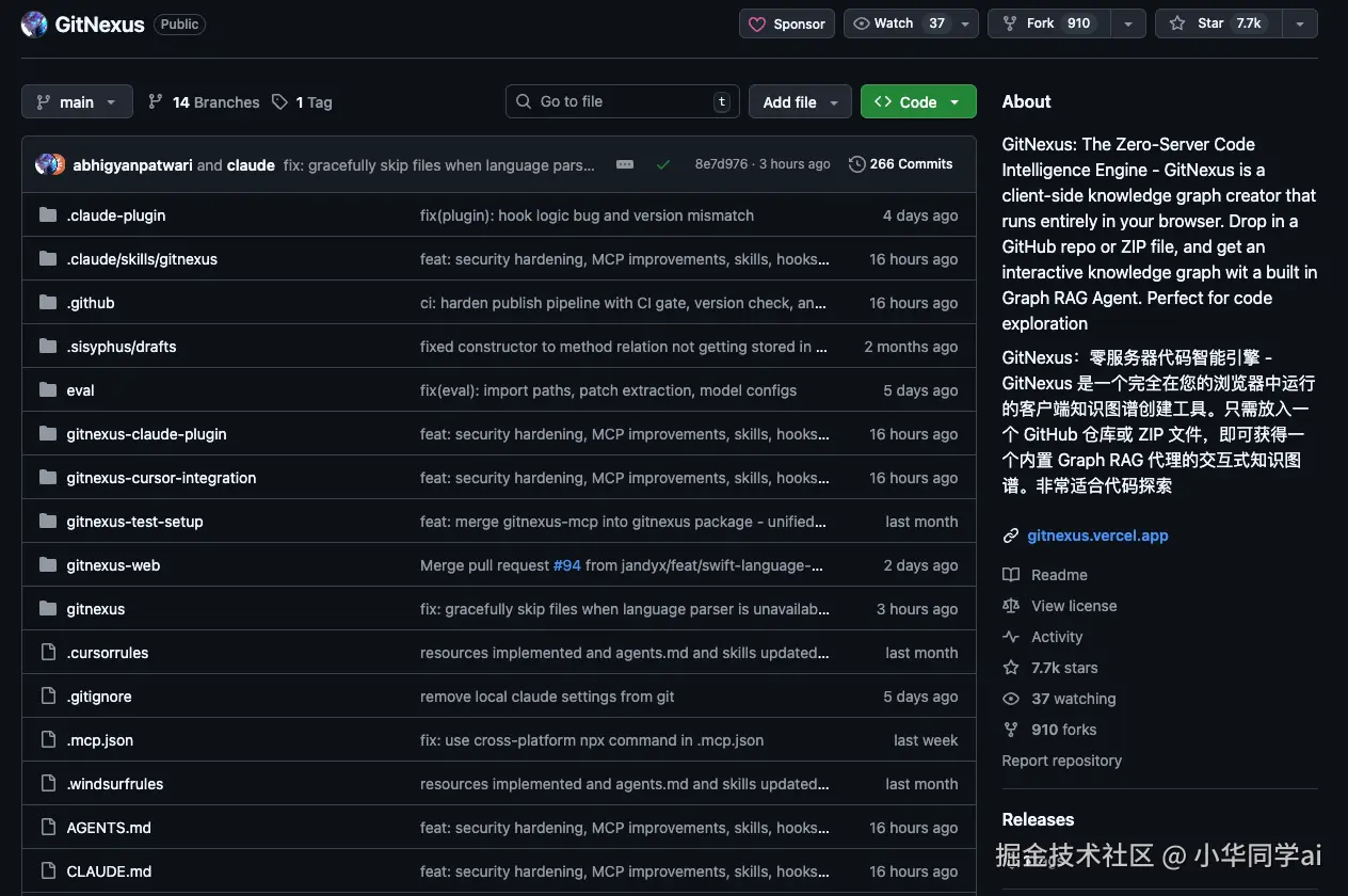 GitNexus是一个完全在浏览器中运行的零服务器代码智能引擎,它能把任何GitHub仓库或ZIP文件瞬间转换成一张交互式知识图谱,让AI助手真正"看懂"代码之间的依赖关系。 简单来说,它就像给AI装上了一副"X光眼镜"——原本AI改代码全靠猜,改完这里崩那里;现在AI能透视整个代码库的架构,精确知道每个函数被谁调用、改动会影响哪些地方。更夸张的是,这一切完全在本地或浏览器完成,代码不需要上传到任何服务器,隐私绝对安全。