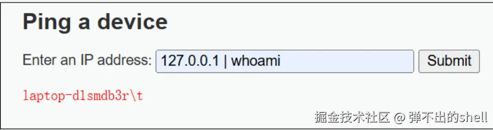 输入框接受 IP 地址执行 ping 命令,未过滤特殊字符,可通过管道符拼接任意系统命令。