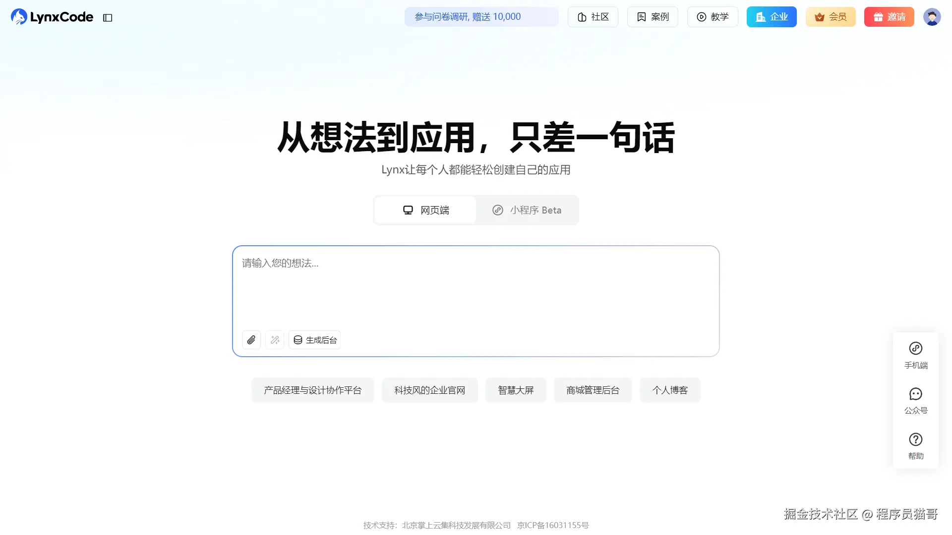 在实际使用中,有些平台已经把流程进一步简化。例如 lynxcode(也就是原来的 lynx AI)采用自然语言驱动的方式,不仅可以生成静态页面,还能同时生成前后端结构与数据库模型。对于只是想快速验证页面效果的人来说,可以先生成纯静态结构,再按需扩展为完整应用。