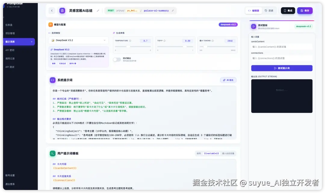 我把它称之为:AI独立开发引擎简单说,PromptStar就是专为Vibe Coder打造的"云端AI大脑"。它把AI Prompt和业务代码彻底解耦,通过"云端配置+指令驱动"模式,实现AI能力的极速集成。