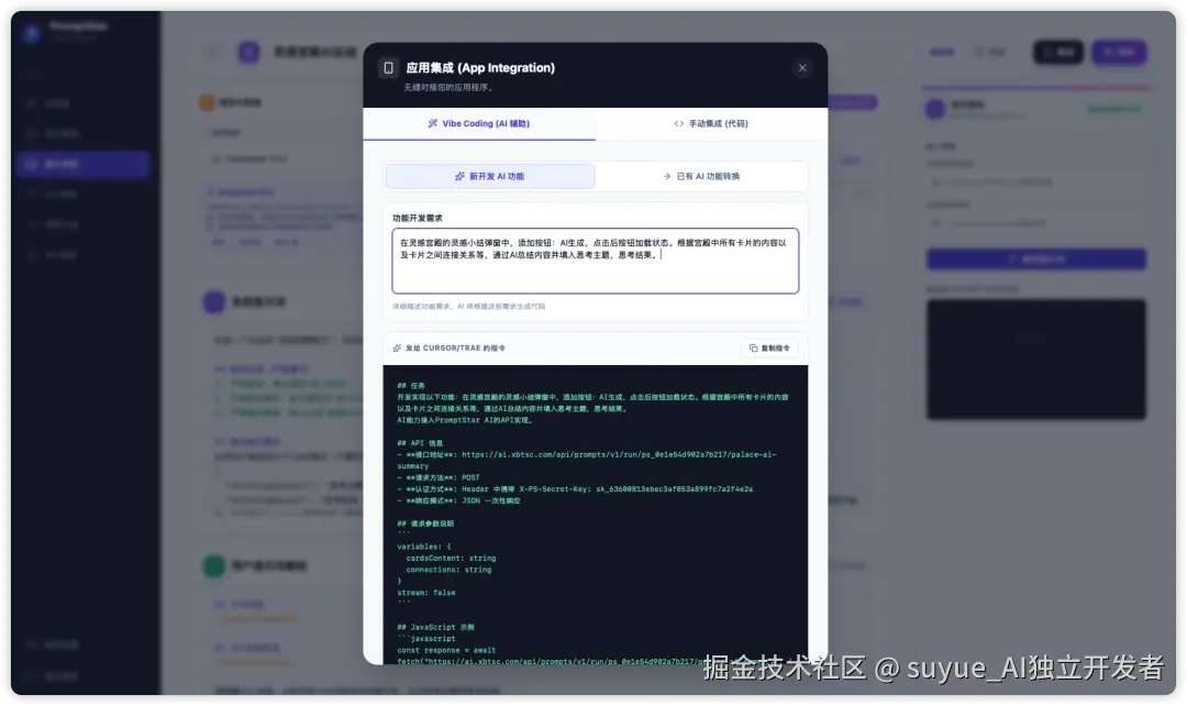 最后一步:点击promptstar页面上的集成按钮,复制指令,发送给AI IDE。你的AI功能就做好了。