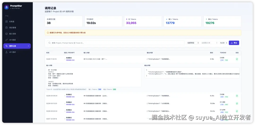 PromptStar会记录每次API调用的详细信息,包括: