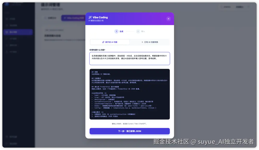 第一步:在PromptStar点击Vibe Coding向导,输入你要实现的功能