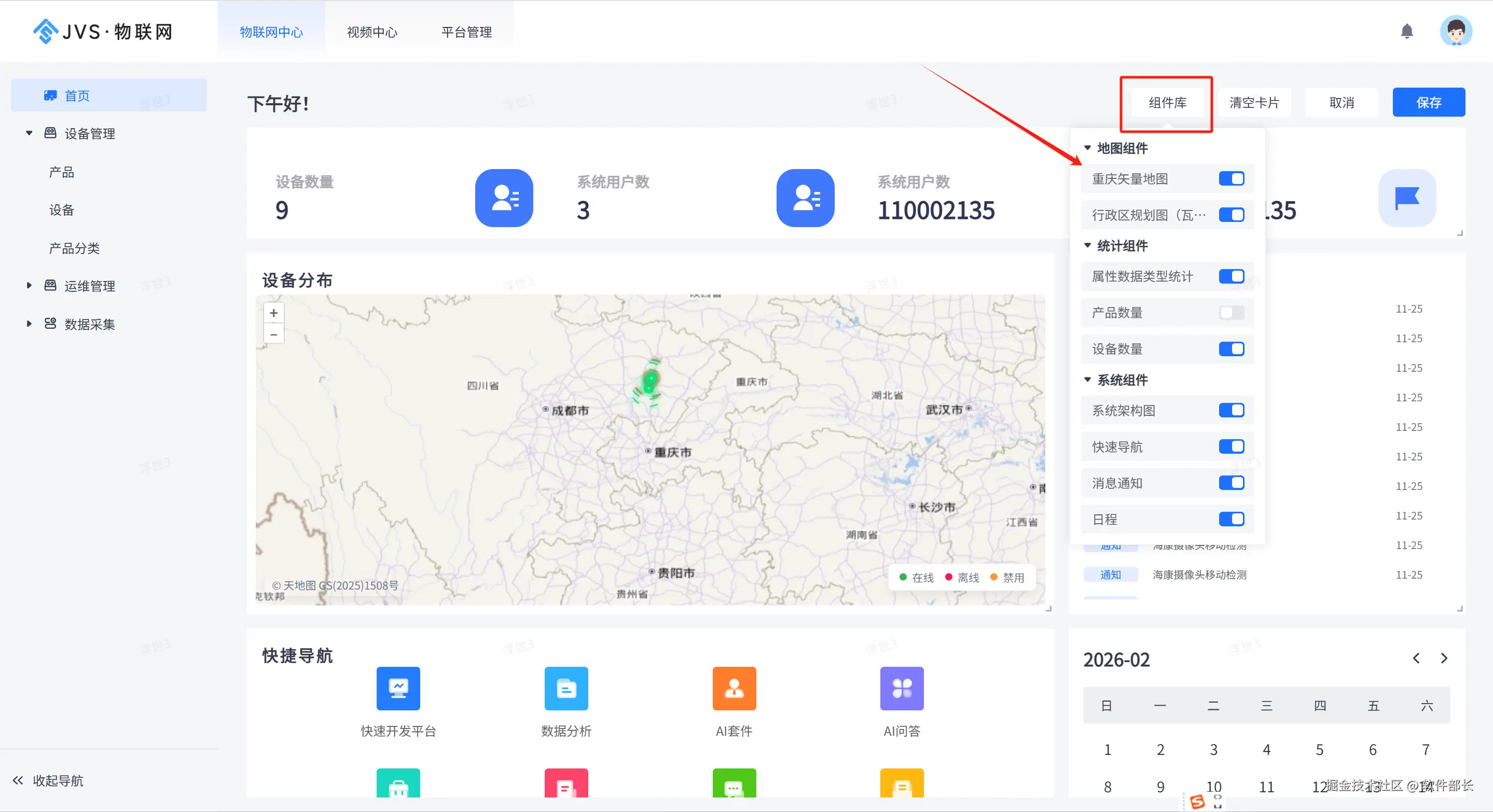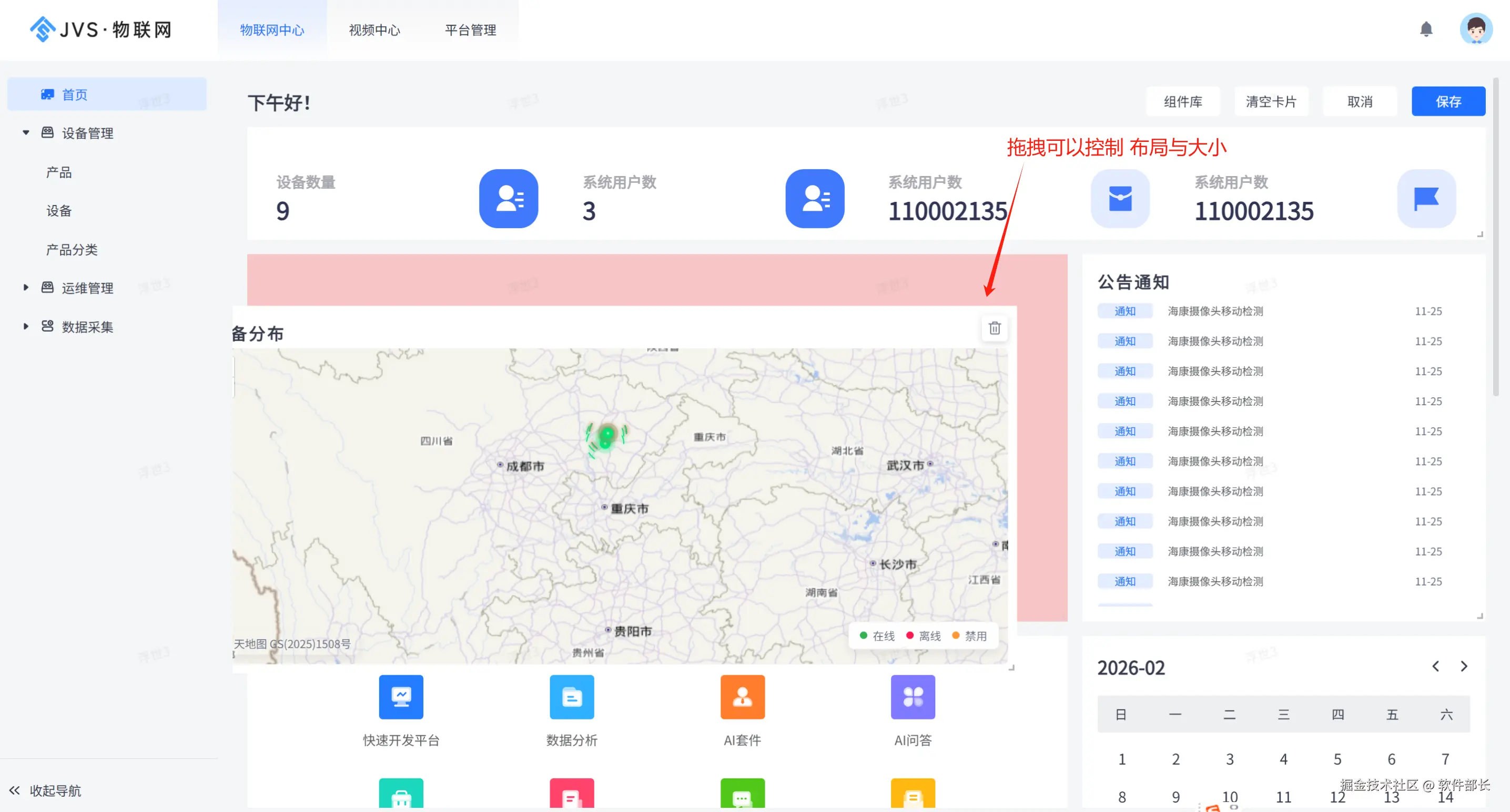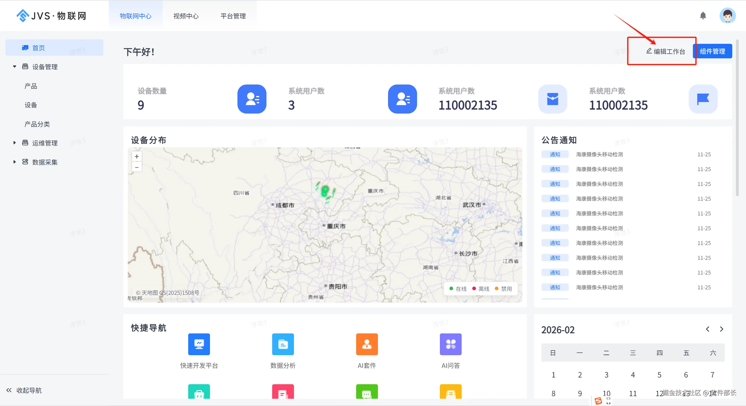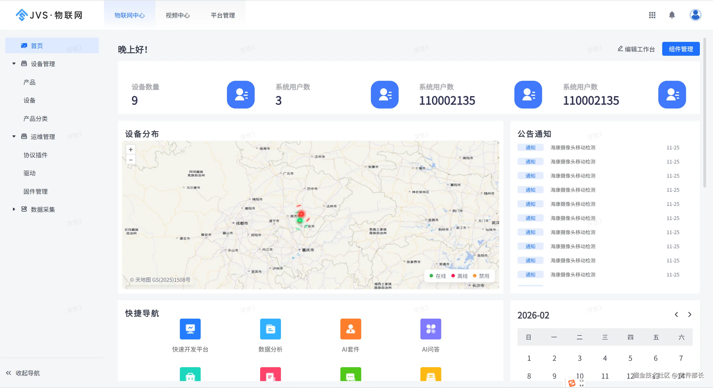 JVS 物联网应用平台的首页是平台的总控枢纽部分。它集成了数据监控、功能导航和日常运营工具这三大核心功能:
