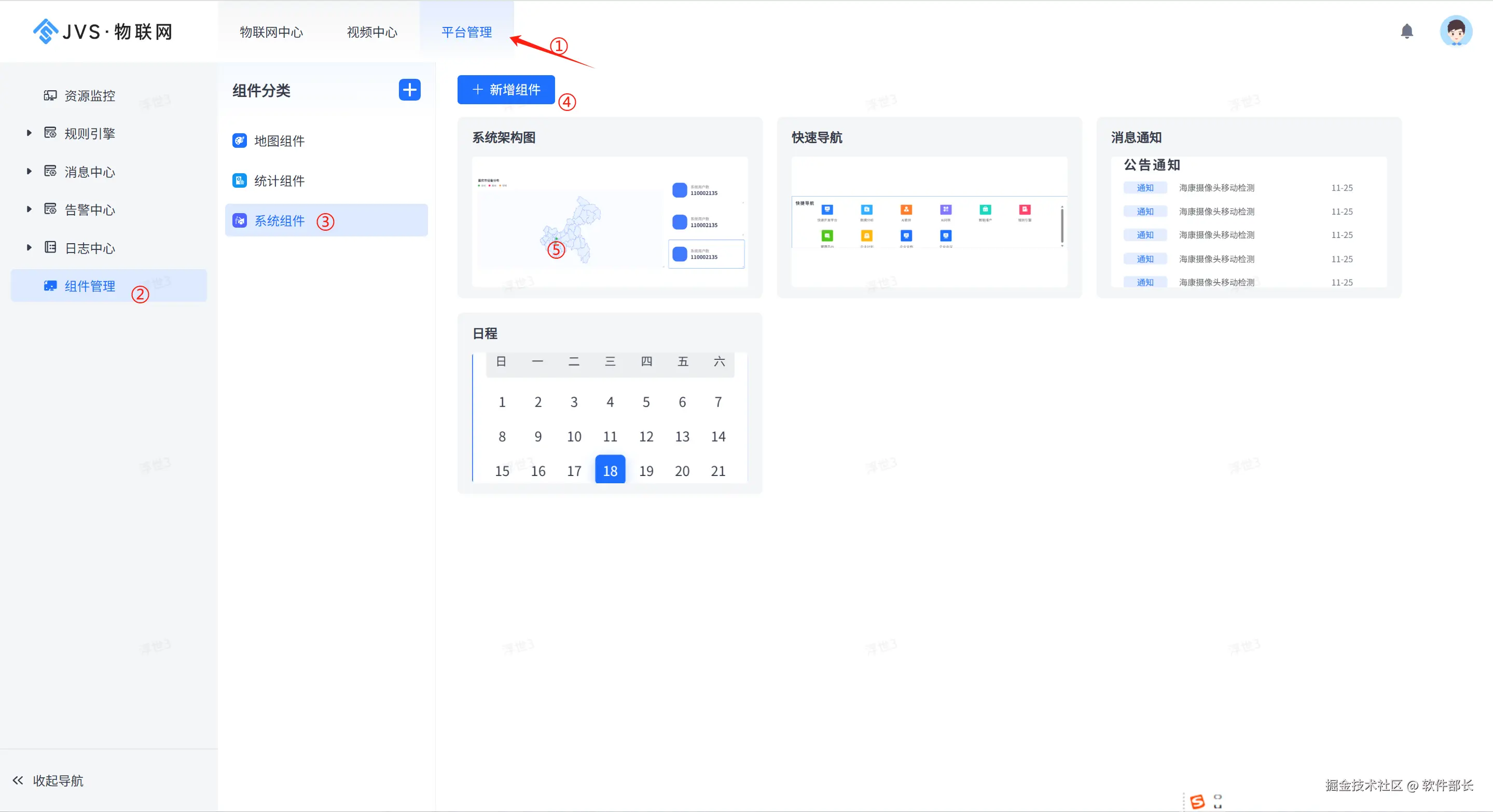 以JVS物联网为例,系统提供了可配置可视化的门户,打破了传统管理界面千篇一律的束缚。用户可以自由设计信息看板,实现千人千面的信息视图。