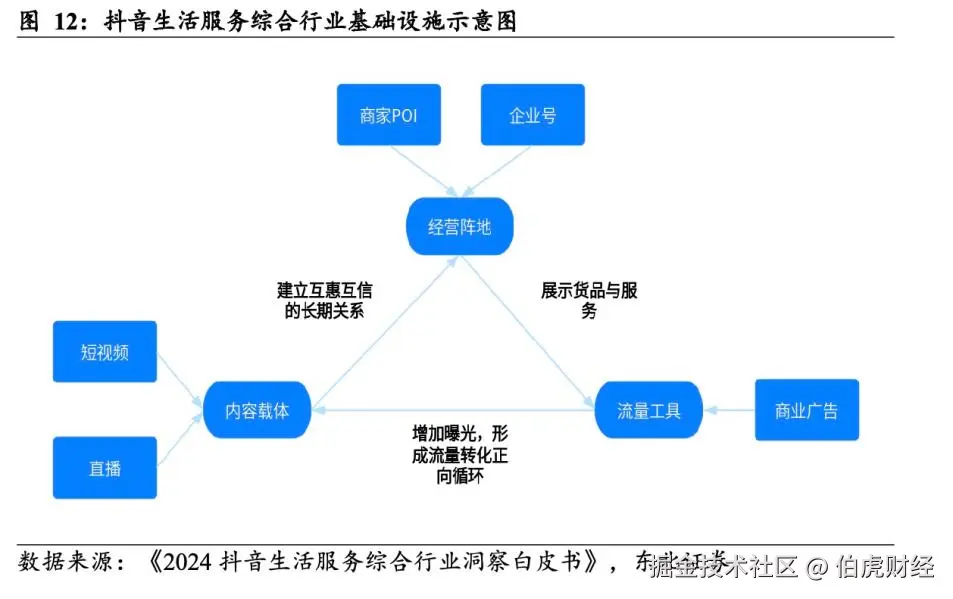 东北证券指出,商家以企业号为线上经营身份的核心,以POI(线下门店)为线上线下的连接枢纽,在抖音上搭建稳定的经营阵地。围绕这一阵地,品牌通过短视频和直播两大内容载体持续输出产品信息和场景化故事,再配合流量工具和商业广告进行曝光加速,形成“内容—流量—转化”的闭环,实现生意增长。