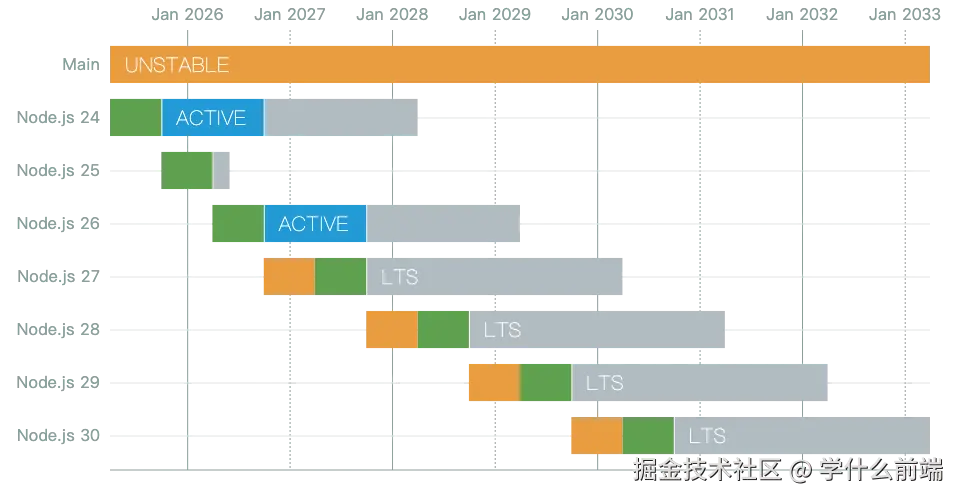 Node.js26 依然遵循旧的发布模式,在 2026 年 10 月进入 LTS,维护到 2029 年 4 月;是旧模式的最后一个版本。