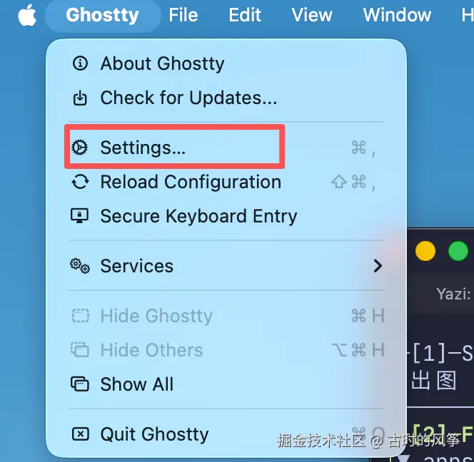 保存后重启 Ghostty或者点击设置中的 Reload Configuration 。