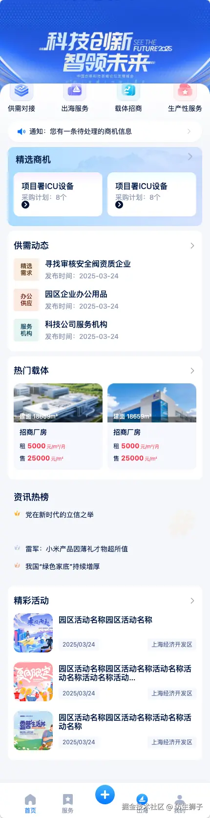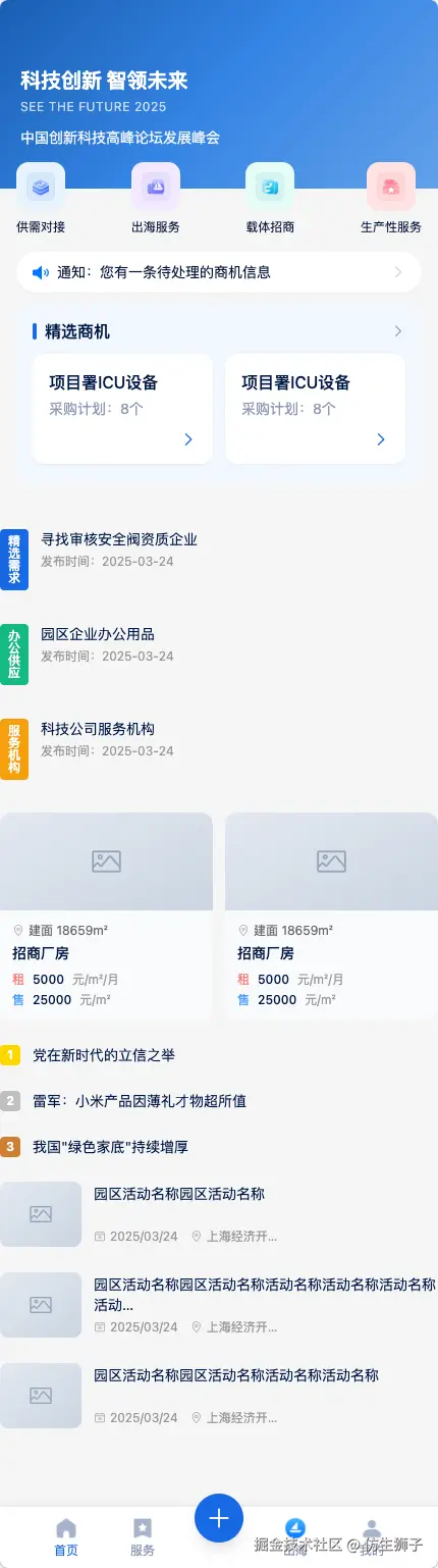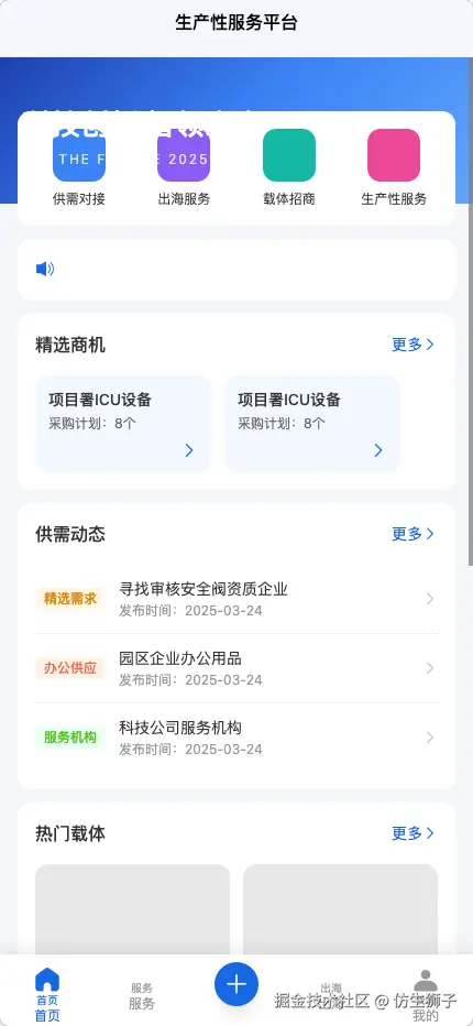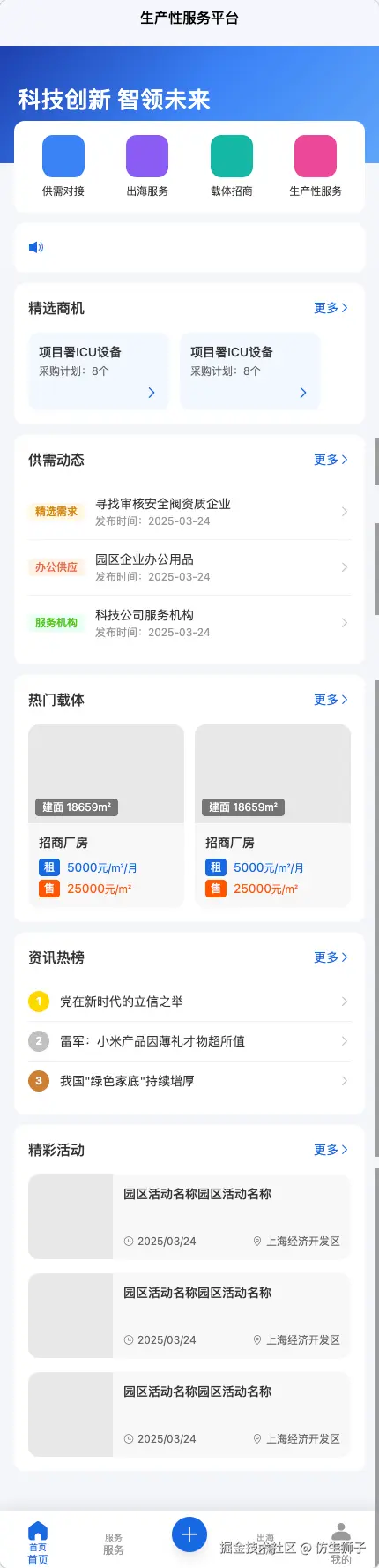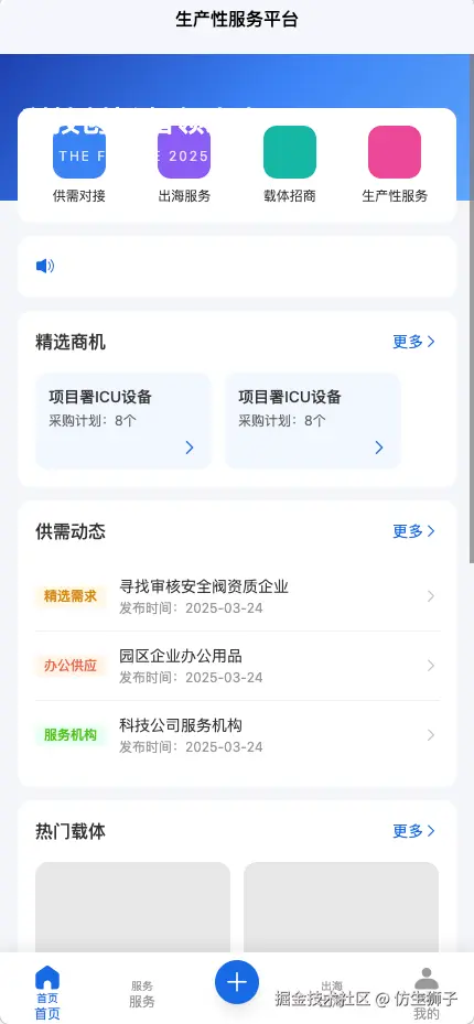 * 接下来,在 producer-services-v2/home.vue 实现首页。