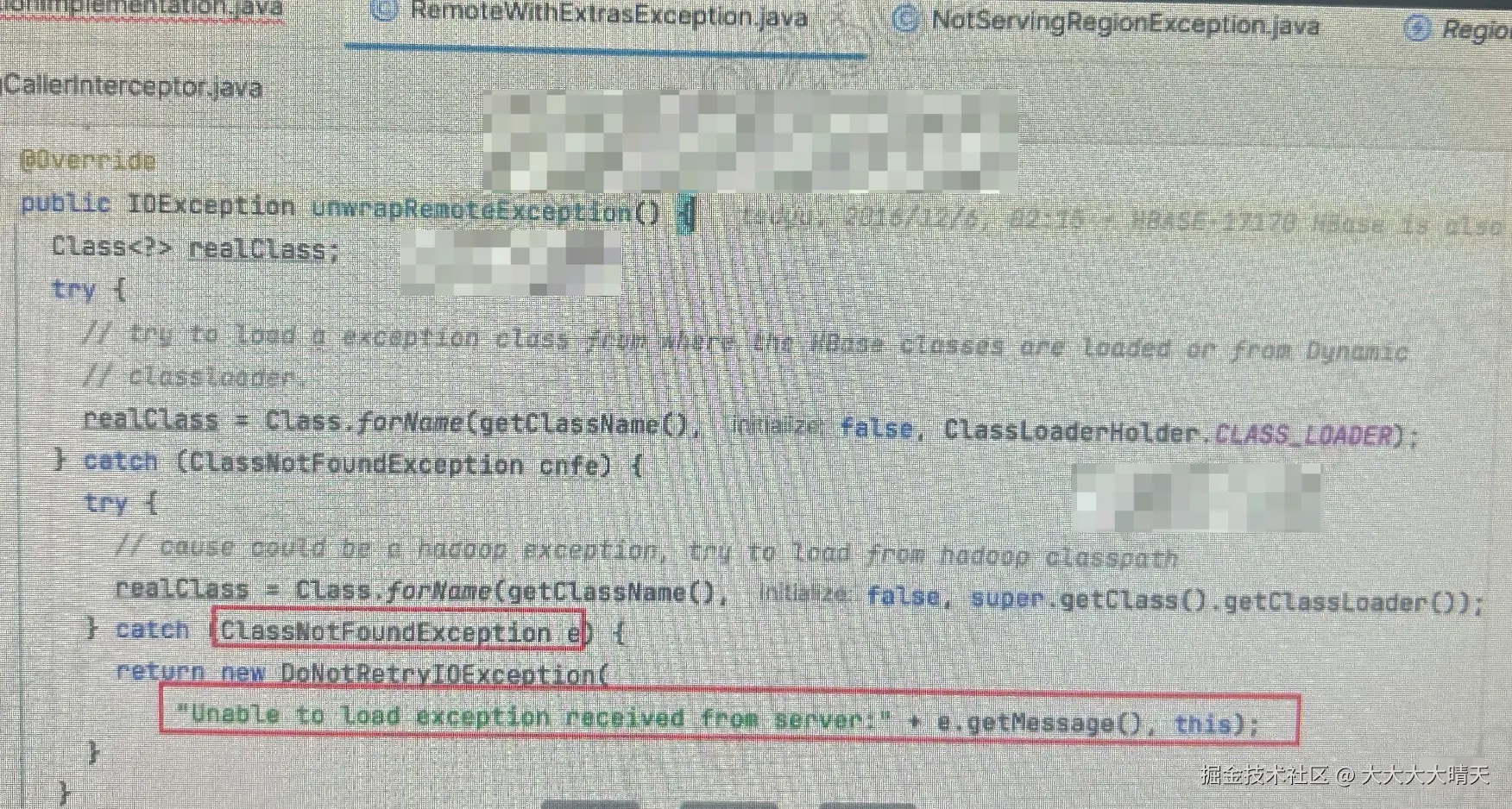 服务端返回的异常类型名称为 org.apache.hadoop.hbase.NotServingRegionException。客户端尝试用 Class.forName加载这个类,如果失败则捕获 ClassNotFoundException,最终包装成 DoNotRetryIOException抛出。DoNotRetryIOException是一个不可重试异常,客户端收到后会直接失败,不会刷新 MetaCache。