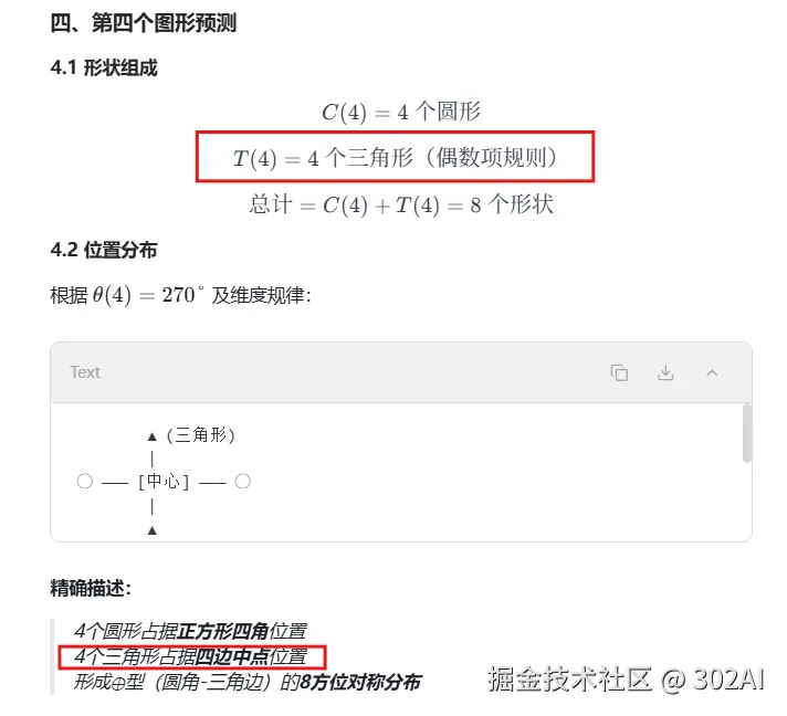 提示词:观察以下图形序列:第一个图形有1个圆形在上方和1个三角形在下方;第二个有2个圆形在左侧和2个三角形在右侧,位置交替;第三个有3个圆形环绕1个三角形。请预测第四个图形的精确组成,包括形状数量、位置分布,并用数学公式(如n阶序列)证明规律(必须解释递增模式和位置变换逻辑)。