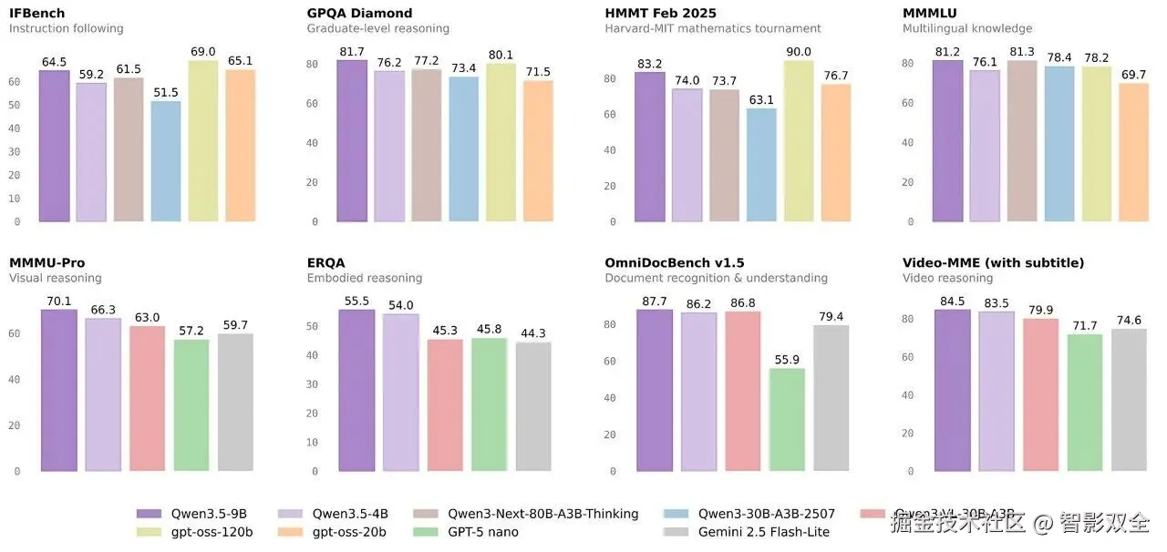 至此,千问 3.5 家族已开源 Qwen3.5-397B-A17B 的大尺寸模型,Qwen3.5-122-A10B、Qwen3.5-35B-A3B、Qwen3.5-27B 等 3 个中型尺寸模型,以及此次开源的 Qwen3.5-9B/4B/2B/0.8B 的 4 款小尺寸模型。