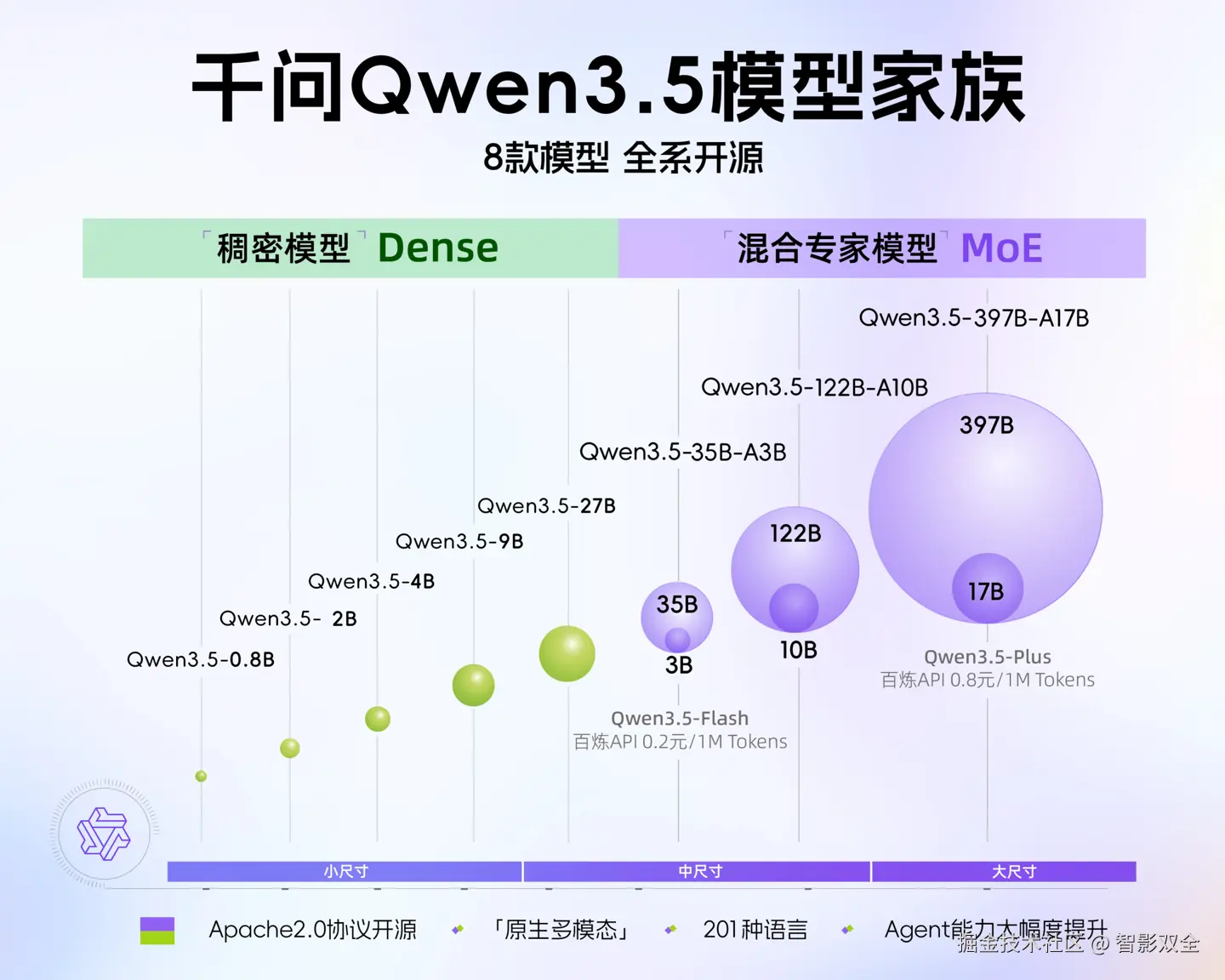 值得一提的是,此次4款小模型的开源,也让千问3.5家族的开源布局彻底完善。截至目前,千问3.5家族已形成“大中小”全尺寸开源矩阵:不仅有Qwen3.5-397B-A17B这样的旗舰大模型,还有Qwen3.5-122-A10B、Qwen3.5-35B-A3B、Qwen3.5-27B三款中型模型,再加上此次的4款小模型,实现了全场景覆盖,满足不同开发者和企业的需求。