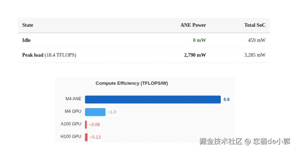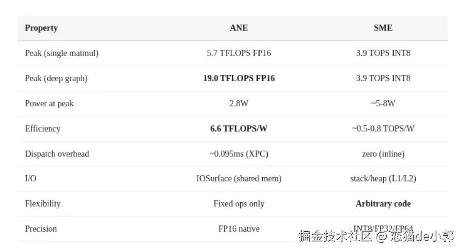 从这点看,ANE 不是通用 GPU,而是卷积优化机器 + 深流水线架构,总结下来:一个拥有 19 TFLOPS FP16 算力、32MB SRAM 缓存的“卷积加速器”,需要通过图编译的批处理来喂饱其 16 核流水线,并具备移动端顶级的电源管理能力。