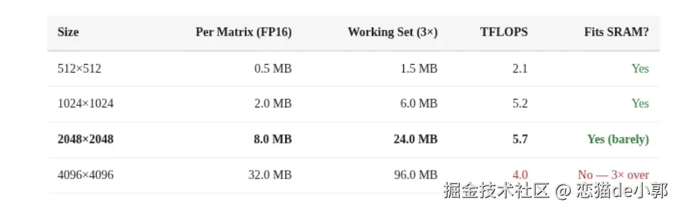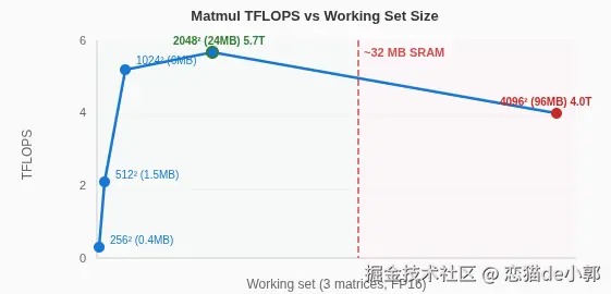 - maderix 通过不断扩展矩阵乘法的规模(Scaling Test),观察性能出现急剧下降的“断崖点”,由此反向推测出 ANE 内部拥有大约 32MB 的高速 SRAM 缓存,超过这个容量限制就会导致性能暴跌