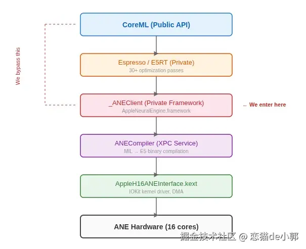 近日,有个大佬通过挖掘 Apple Neural Engine (ANE) ,针对苹果芯片底层 AI 逻辑做了一次细节公开,因为苹果 ANE(M4 芯片上为 16 核运算单元)长期以来是一个纯粹的“黑盒”,对大家来说缺少公开接口、文档和指令集架构 (ISA),开发者只能通过 CoreML 框架间接调用,而这次作者 maderix 通过挖掘把 CoreML 给大家理清了一个清晰的轮廓。