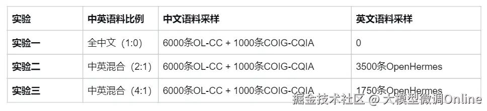 数据处理完成后,我们设计了三组不同中英配比的“实验”,想看看数据比例对模型表现的影响: