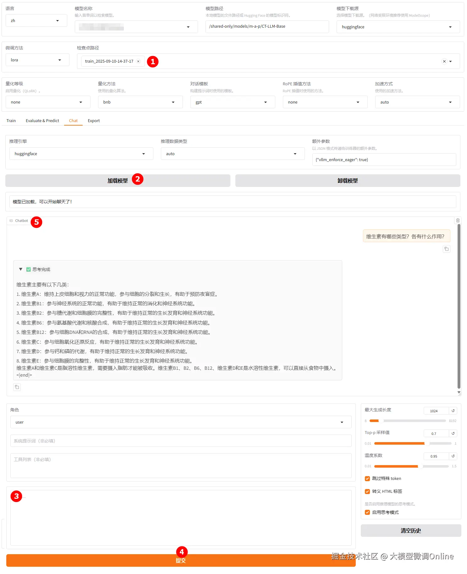 训练完成后,选择各个实验的检查点路径,在Chat界面即可观察模型回答。(注意:切换不同实验的模型时,要先卸载当前模型,再更换检查点路径。)