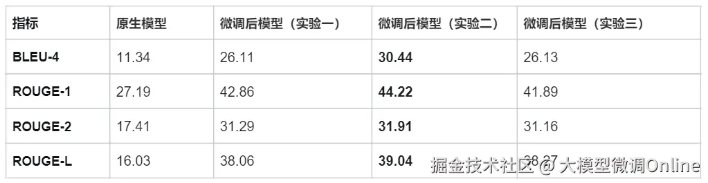 实验一(全中文)评估结果解读:BLEU-4提升至26.11,说明生成文本与参考答案的短语重合度较高,模型生成能力明显提升。ROUGE-1(42.86)、ROUGE-2(31.29)、ROUGE-L(38.06)显示模型在词汇覆盖、短语匹配和句法连贯性方面表现良好。