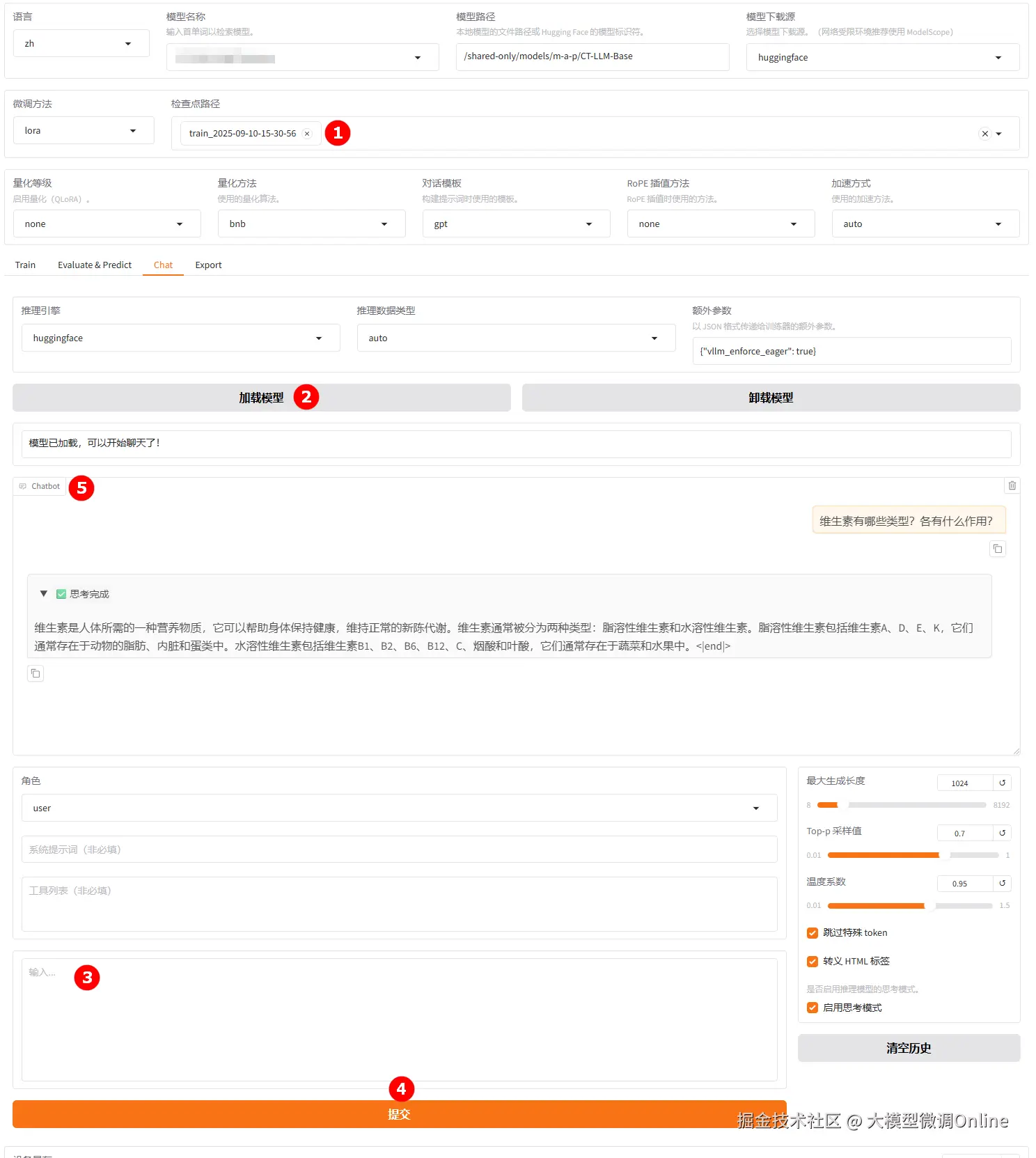3.注意区分:因为实验较多,记得区分不同实验的输出目录,后续对话和评估时需要在检查点路径处使用对应目录。
