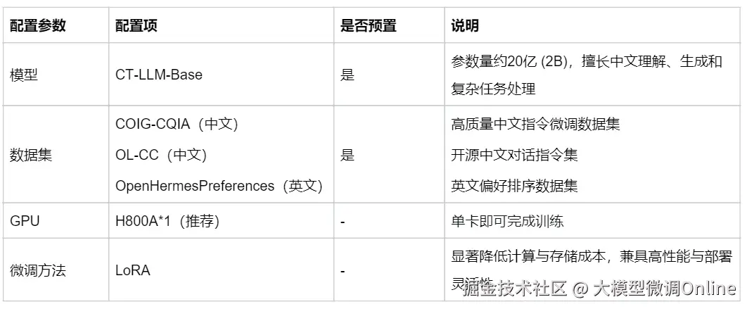 Chinese Tiny LLM - 2B的定位很特别——它不卷参数规模,而是卷数据质量。研发团队自主构建和整理了大规模高品质中文语料,让这个小个子模型在中文理解、生成和复杂任务处理上有了扎实的底子。但它毕竟是2B模型,还有提升空间。我们的目标很简单:通过精准的指令微调,把它身上那个“隐藏的中文专家”彻底唤醒。在正式上手前,先看看我们的实验配置: