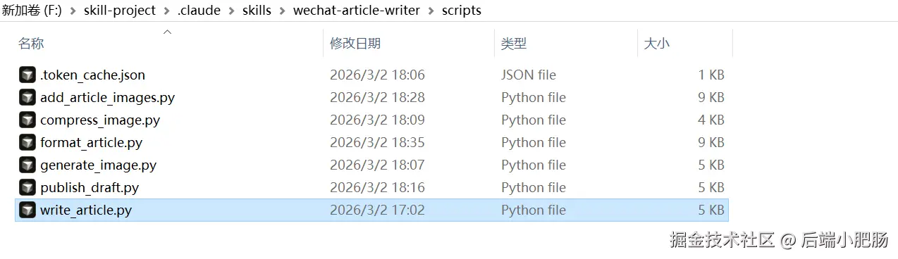光有 SKILL.md 这个总指挥还不行,真正实现功能的是 scripts/ 目录下的 6 个 Python 脚本。我把整个发文流程像流水线一样拆解成了 6 个独立的模块。